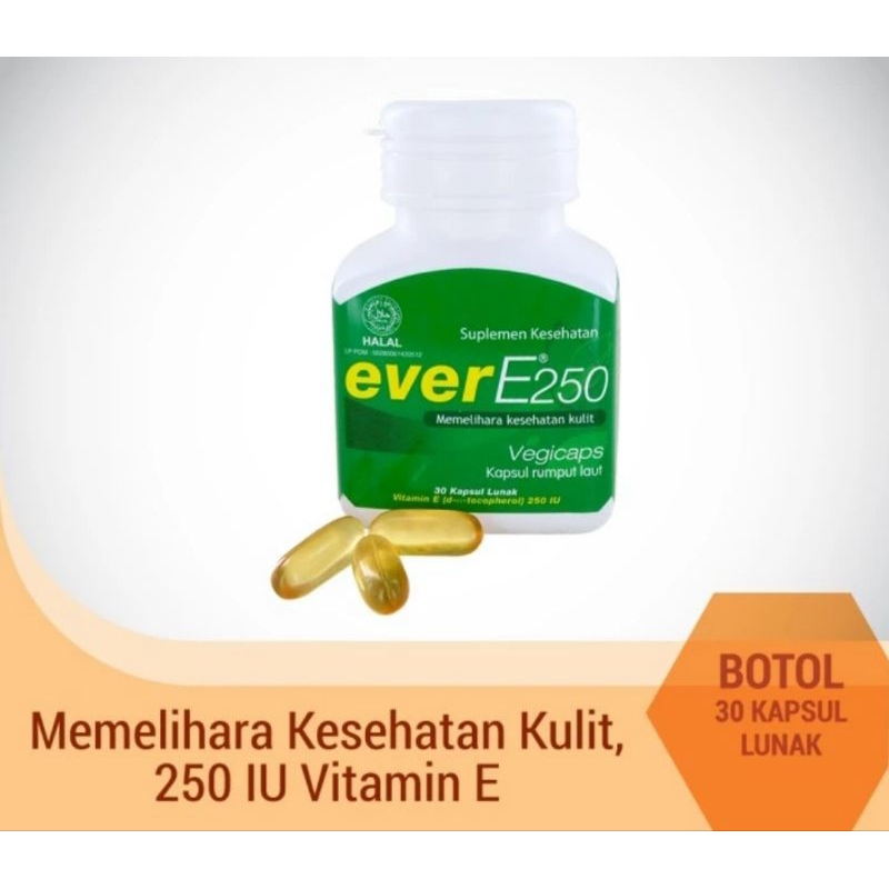 Perawatan & Kecantikan > Perawatan Tubuh > Perawatan Tubuh Lainnya > EVER E 250 VITAMIN E BOTOL ISI 30KAPSUL/Rumput laut kulit sehat (BELI 1 FREE MASKER)