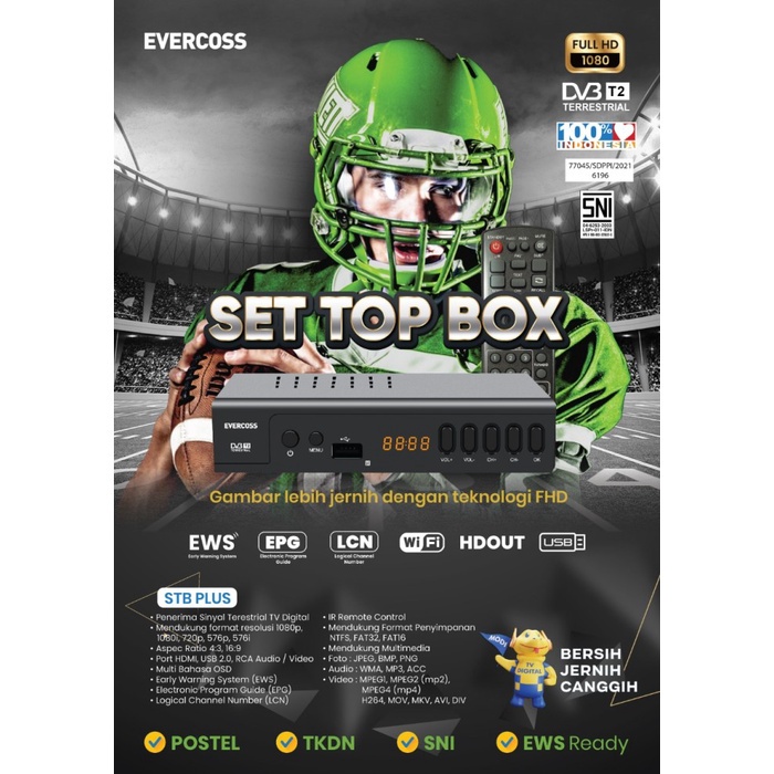 SET TOP BOX PLUS EVERCOSS merupakan receiver TV digital yang sudah support resolusi Full HD, yang membuat kualitas menonton TV menjadi naik kelas, serta dapat merekan siaran yang berlangsung. Untuk fungsi Miracast harus menambah dongle.
