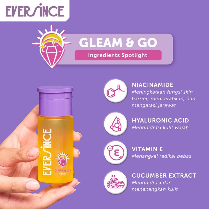 2. EVERSINCE GLEAM & GO TONER (100ml) A lightweight toner that hydrates and brightens the skin, leaving your face glowing and radiant. Toner ringan yang menghidrasi dan mencerahkan kulit untuk wajah tampak sehat dan bercahaya. NO BPOM: NA18221200876