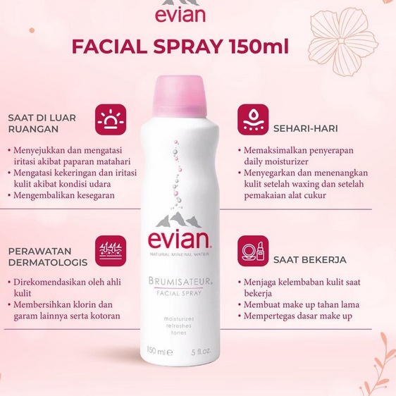 Benefit : SEHARI - HARI : memaksimalkan penyerapan daily moisturiser (cream/ lotion), menggunakan pembersih, menenangkan kilit setelah waxing dan setelah pemakaian alat cukur; SAAT BEKERJA: Menjaga kelembaban kulit saat bekerja tanpa harus menghapus make-up, mempertahankan make-up agar lebih tahan lama sepanjang hari, mepertegas dasar make-up dan menyempurnakan hasil riasan; SAAT BEPERGIAN/DI LUAR RUANGAN: Menyejukkan dan mengatasi iritasi akibat paparan matahari, angin, kosmetik tertentu dan air yang kurang bersih. Dengan cepat kekeringan dan iritasi kulit yang diakibatkan karena buruknya kondisi udara saat bepergian. Mengembalikan kesegaran di saat berkendara. PERAWATAN DERMATOLOGIS: Direkomendasikan oleh ahli kulit untuk menjaga kesehatan kulit, Membersihkan clorin dan garam lainnya serta kotoran setelah berenang, berolahraga dan latihan; PERAWATAN KULIT BAYI: membersihkan dan melembutkan kulit bayi yang iritasi, membersihkan tangan dan wajah dengan cepat, menyagarkan kulit bayi ketika merasa panas dalam berkendara