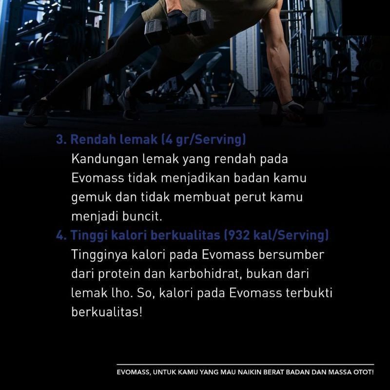 KEUNGGULAN EVOMASS DIBANDINGKAN YANG LAIN: ๐ย Tinggi protein yaitu 52 gr/ serving ๐ย Tinggi kalori berkualitas, 932 kkal/ serving ๐ย Rendah lemak hanya 4 gr/ serving ๐ย Tinggi karbohidrat ๐ย Terdapat 11 gr BCAA yang mampu mencegah terkikisnya otot dan mempercepat proses recovery otot kamu ๐ย Mengandung 8.5 gr Glutamine untuk mencegah kelelahan dan membantu mempercepat pemulihan saat cedera _____________________________