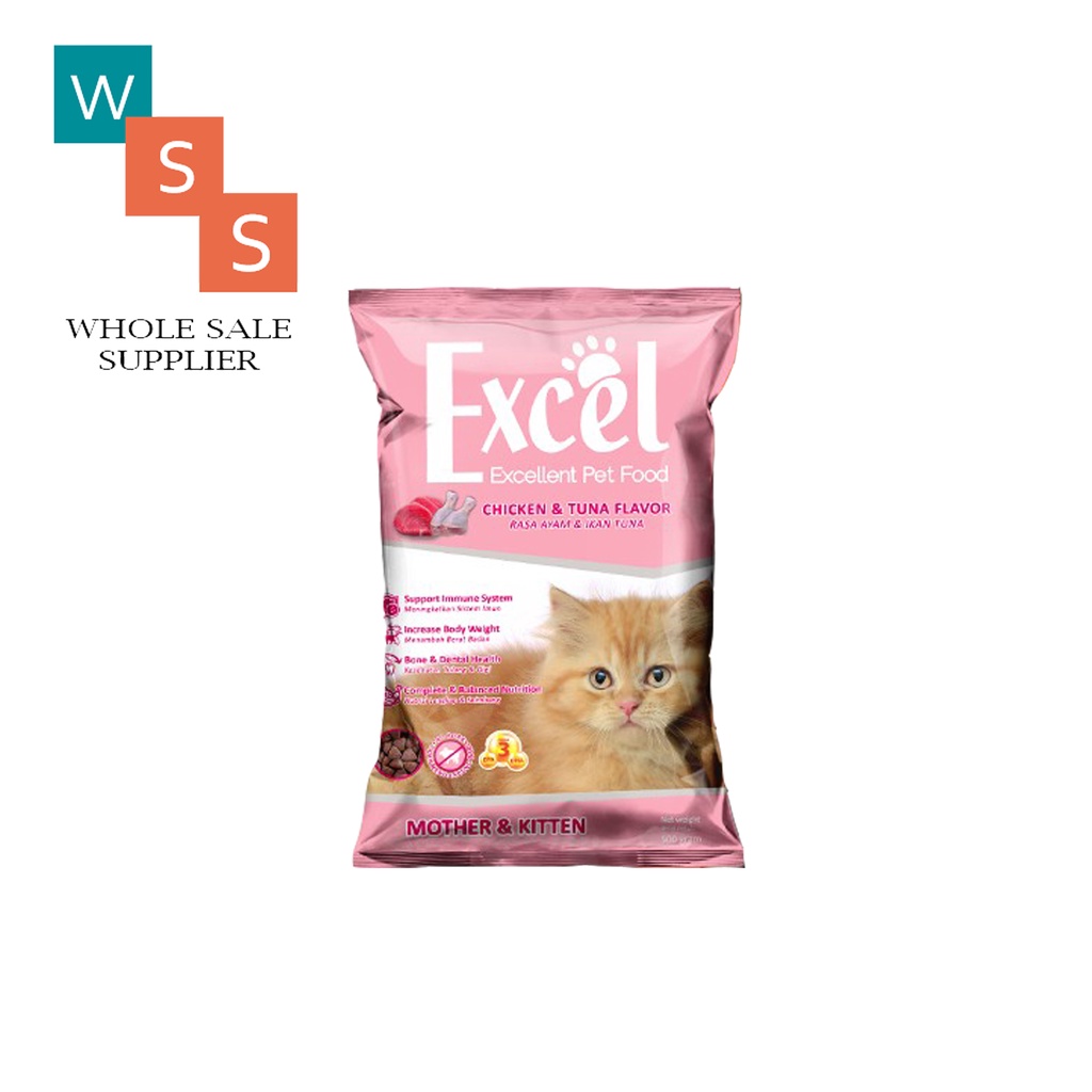 DESKRIPSI : EXCEL CAT adalah jajaran produk berkualitas tinggi kami menggunakan bahan baku impor berkualitas yang 100% alami. Protein tinggi berasal dari daging ayam dan ikan asli, kaya akan taurine, omega 3 dan 6 serta mineral yang baik bagi tubuh; EXCEL CAT merupakan makanan yang bergizi dan lezat bagi kebutuhan kucing Anda, di setiap tahap kehidupannya.