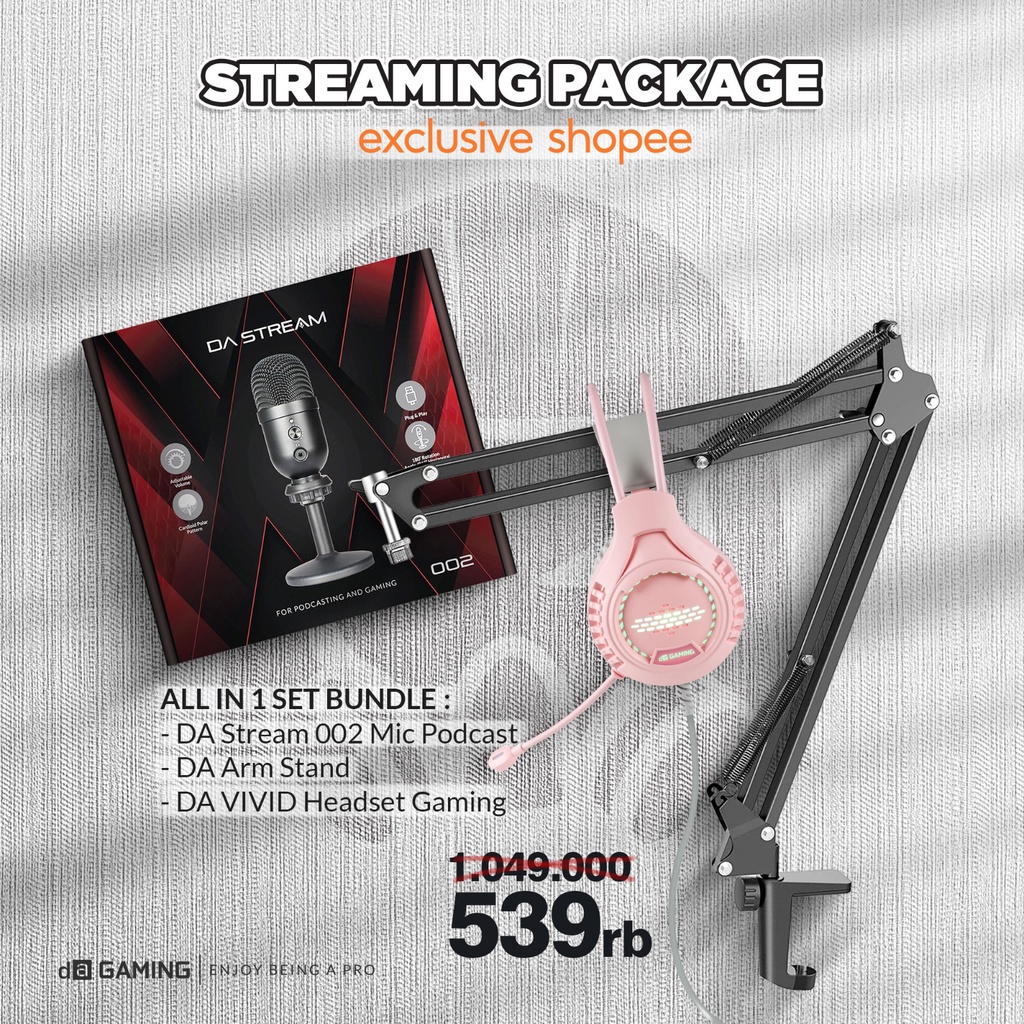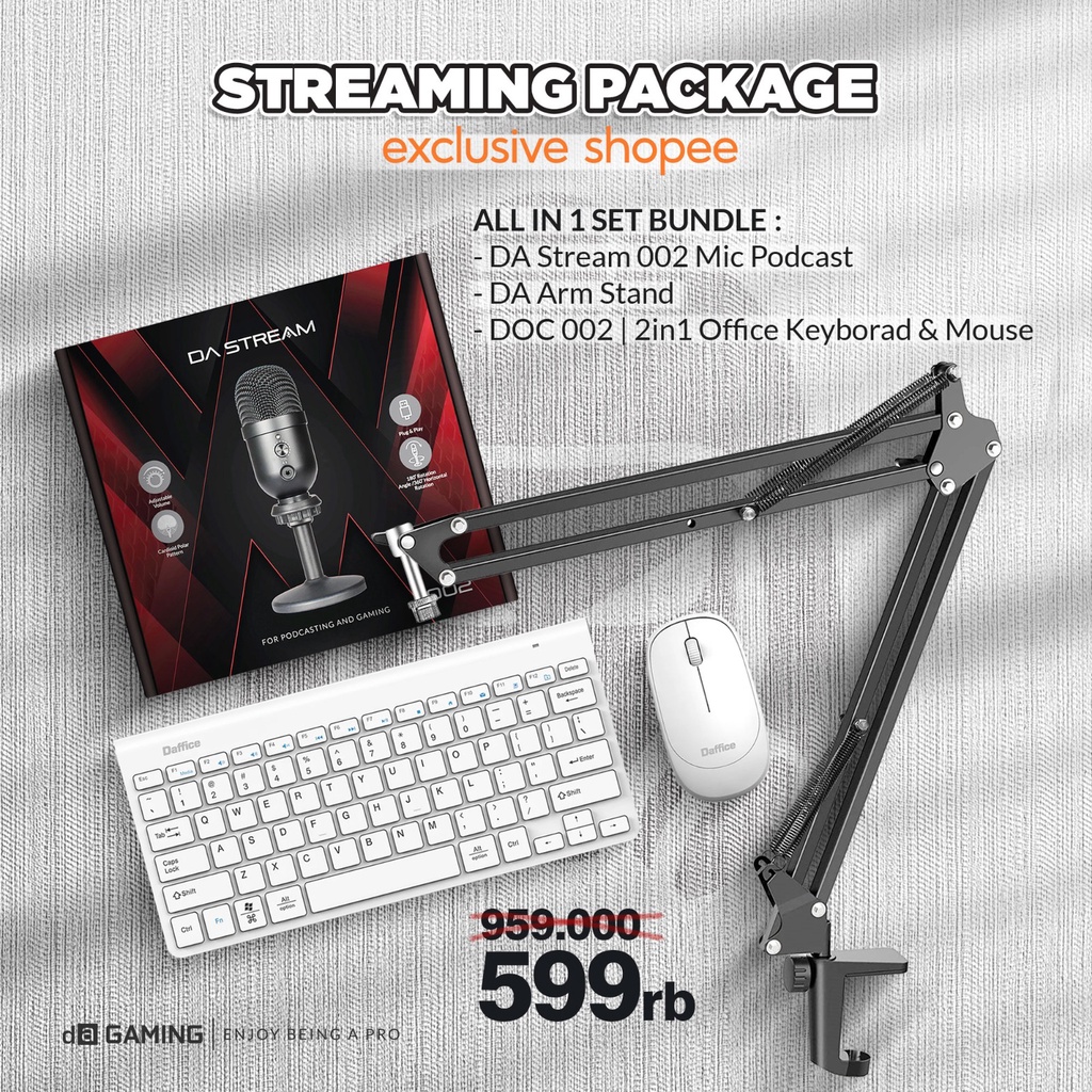 Paket yg di dapat : 1x Digital Alliance Stream Mic Podcast 002 1x Digital Alliance Arm Stand 1x Digital Alliance Keyboard Doc 002 (Key + Mouse)