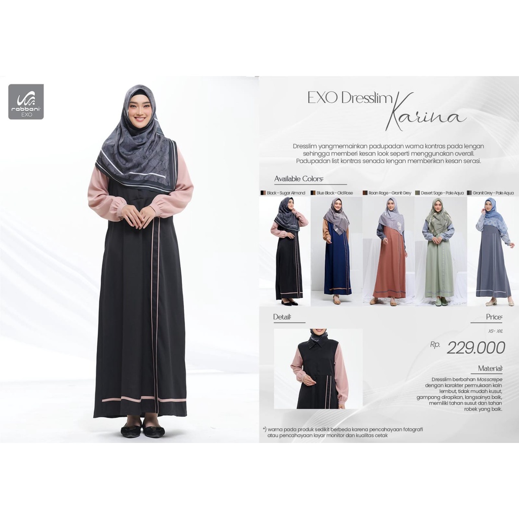 detail produk : - perpaduan 2 warna - bahan Mosscrepe - bagian dada terdapat resleting - Terdapat saku dibagian kanan - lengan kancing - terdapat logo bordir rabbani di bagian lengan . #exodresslim #gamisexo #gamisrabbani #rabbanipurwokerto #exoterbaru