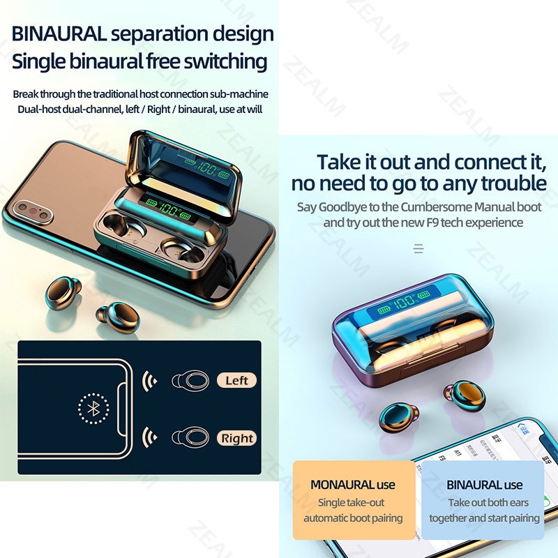Handphone & Aksesoris > Audio Handphone > Earphone, Headphone & Headset > F9 Headset Bluetooth LED Display 2000mah Power Bank Headshet Bloetooth TWS with Mic HIFI Stereo Handset Water Proof Earbuds Wireless Earphone Bluetooth