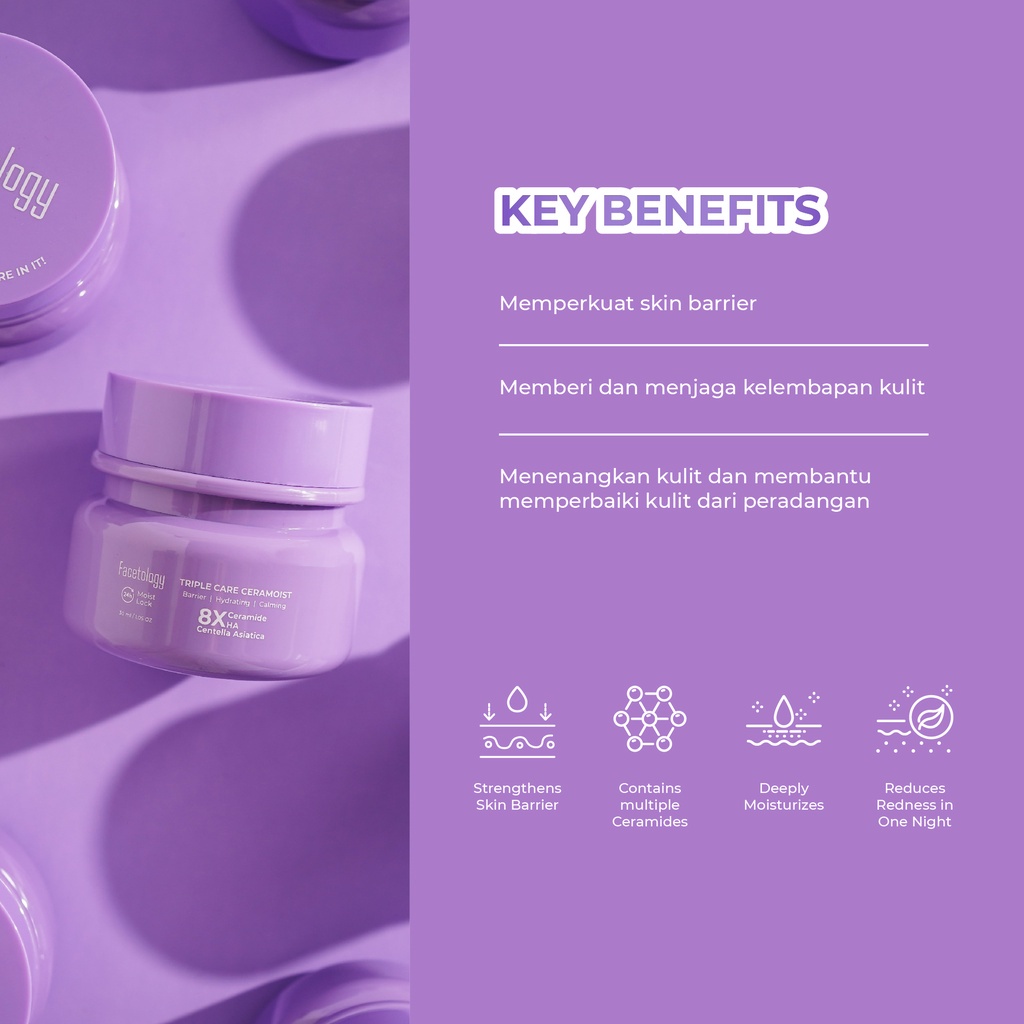 FACETOLOGY Triple Care Ceramoist 30 ml Facial Moisturizer Pelembab Skin Barrier Repair 8X Ceramide Facetology Triple Care Caremoist diformulasikan untuk memenuhi keremajaan wajah mu. Dengan 3 manfaat sekaligus untuk memperbaiki skin barrier wajah, menghidrasi dan menenangkan wajah.