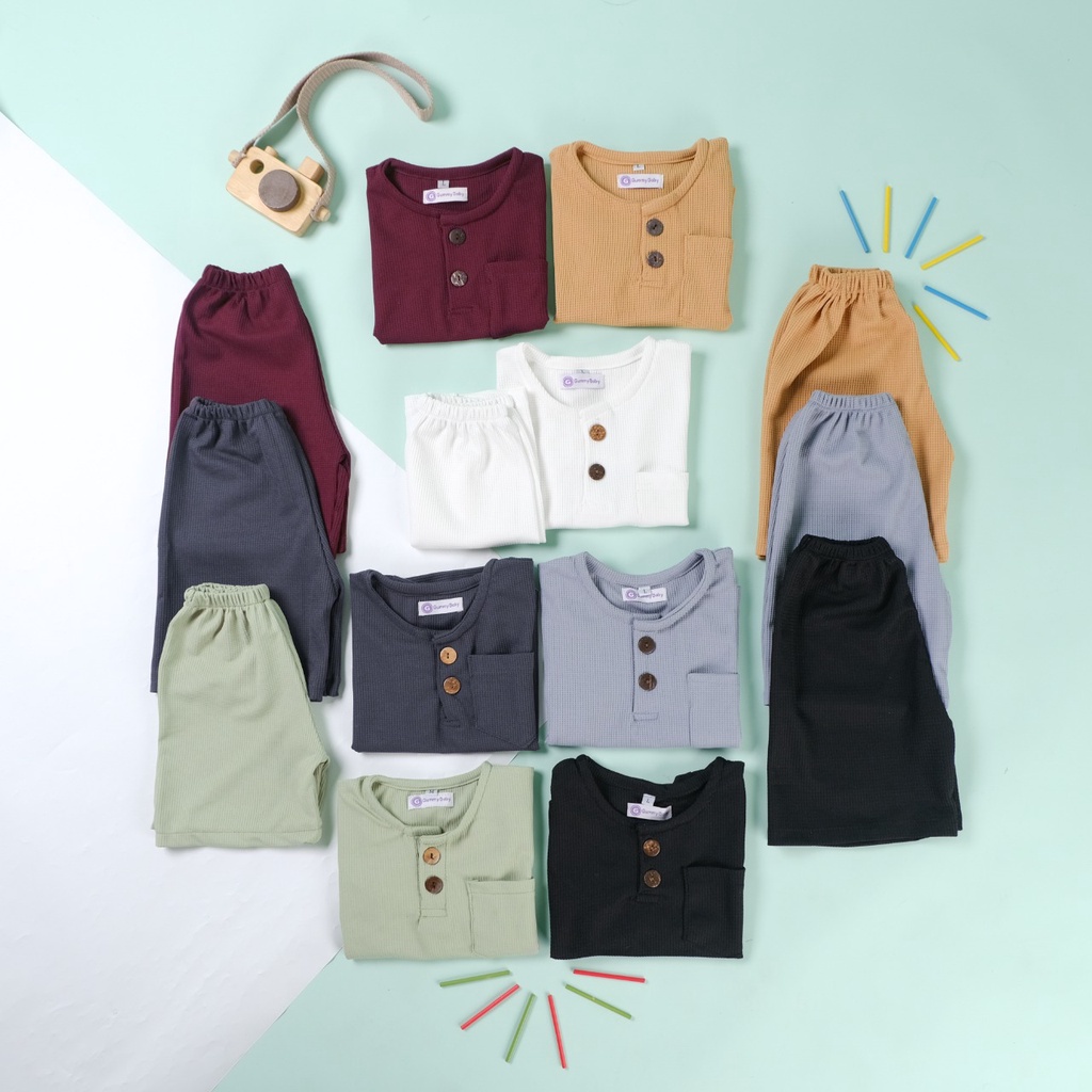 Setelan Anak dengan bahan Waffle Knit yang super stretchy (melar) dan nyaman digunakan sehari-hari ini sangat cocok untuk bayi/anak perempuan dan laki-laki. Detail 2 kancing di dada memberikan kemudahan untuk memasukkan kepala bayi dan saku kecil di sisi kiri menambah kesan simple pada produk. Dalam satu set sudah termasuk baju dan celana.