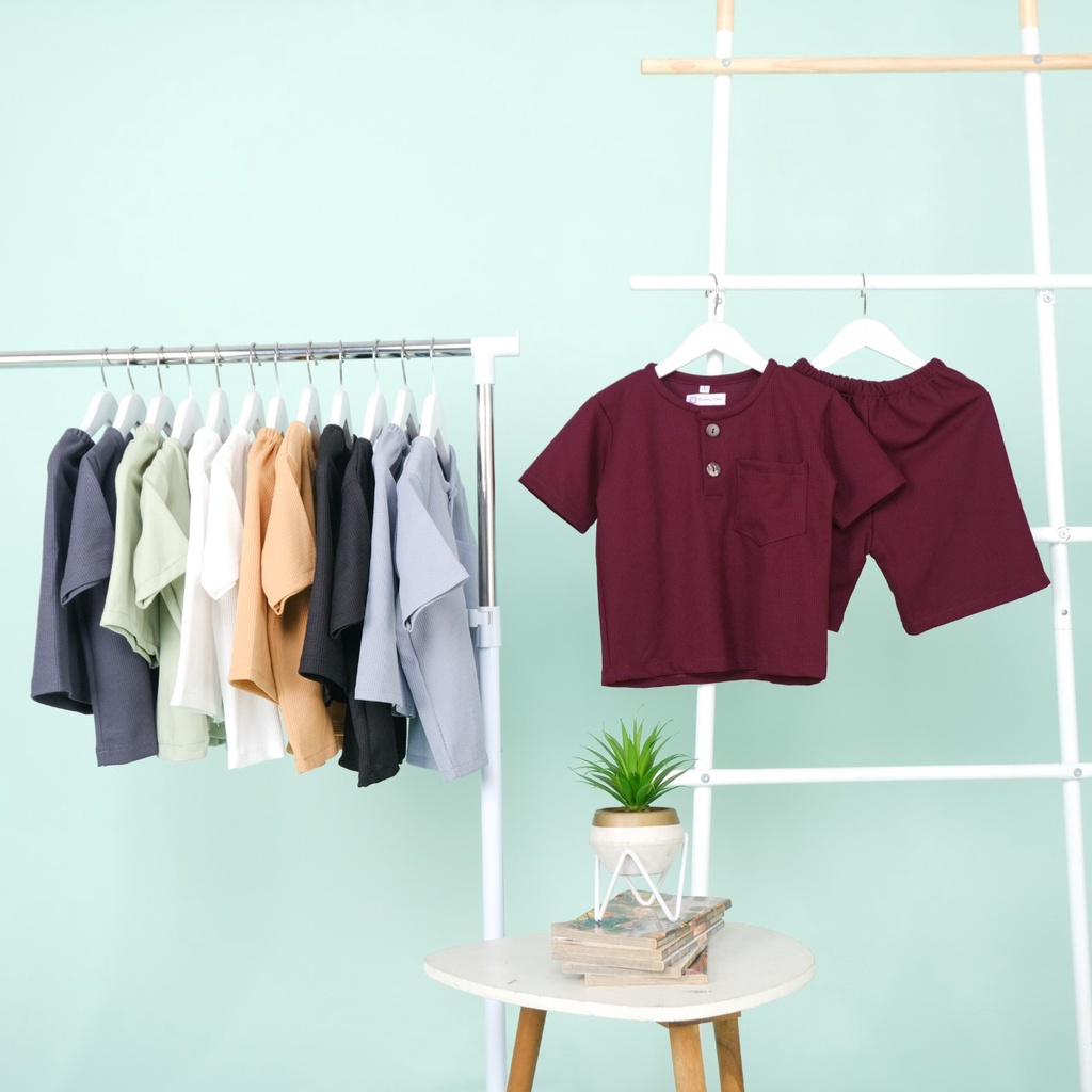 Detail Produk: • Model : Setelan Kaos Pendek dengan half kancing dan celana pendek dengan karet pinggang • Bahan : Waffle Knit (Melar, adem dan nyaman di kulit anak)