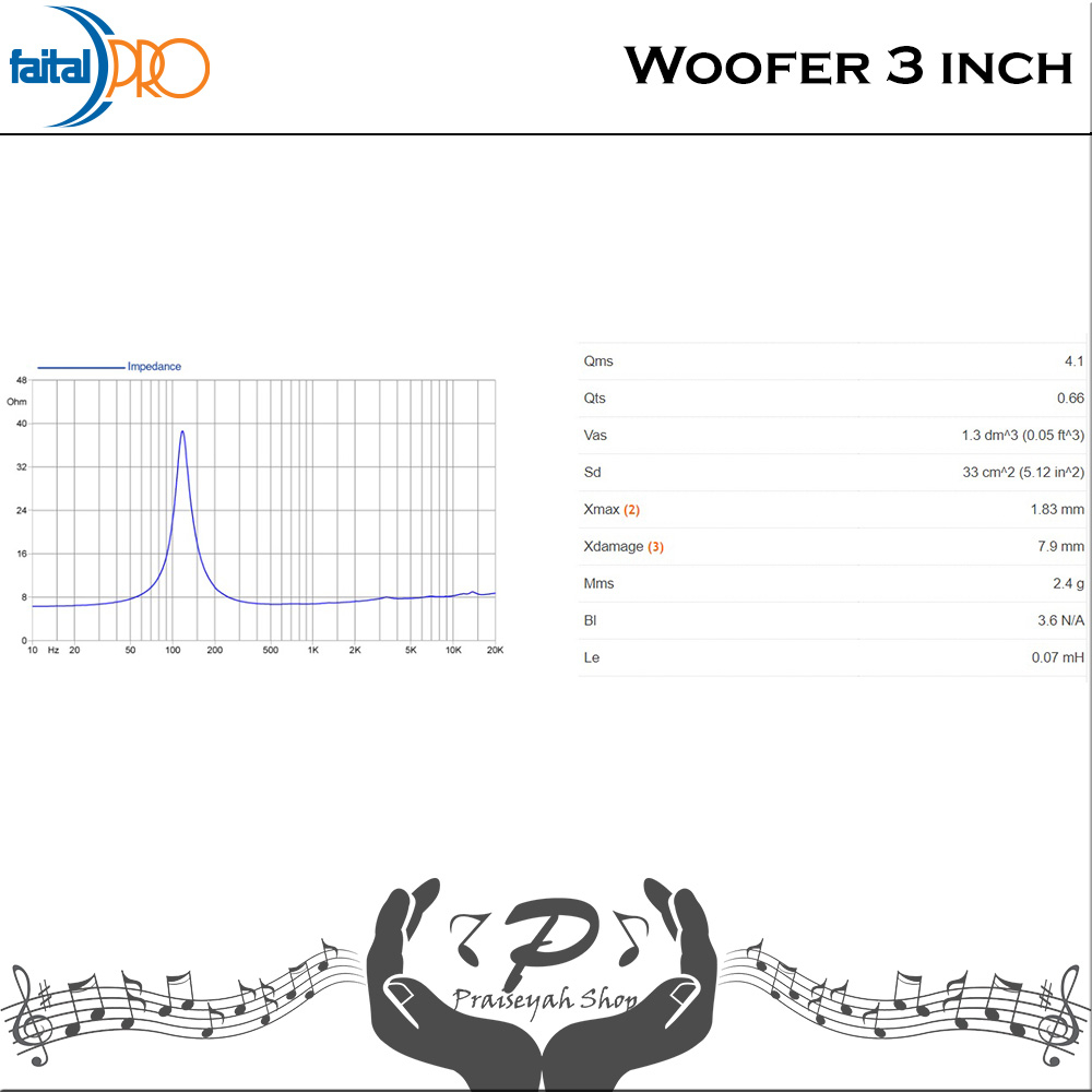 Merk : Faital Made in Italy Ukuran : 3 inch AES Power Handling : 20 W Max Power Handling : 40 W Frequency Range : 100÷20000 Hz Voice Coil Diameter : 19 mm (0.75 in) Sensitivity (1W/1m) : 91 dB Magnet : Ferrite Ring Basket Material : Steel Demodulation : Copper Cap Berat : 545 g Impedance : 8 ohm