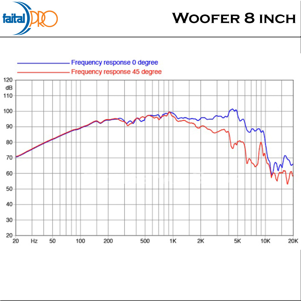 Merk : Faital Made in Italy Ukuran : 8 inch AES Power Handling : 200 W Max Power Handling : 400 W Frequency Range : 80÷6300 Hz Voice Coil Diameter : 52 mm (2 in) Sensitivity (1W/1m) : 96 dB Magnet : Ferrite Ring Basket Material : Aluminum Demodulation : Aluminum Ring Berat : 4.300 g Impedance : 8 ohm