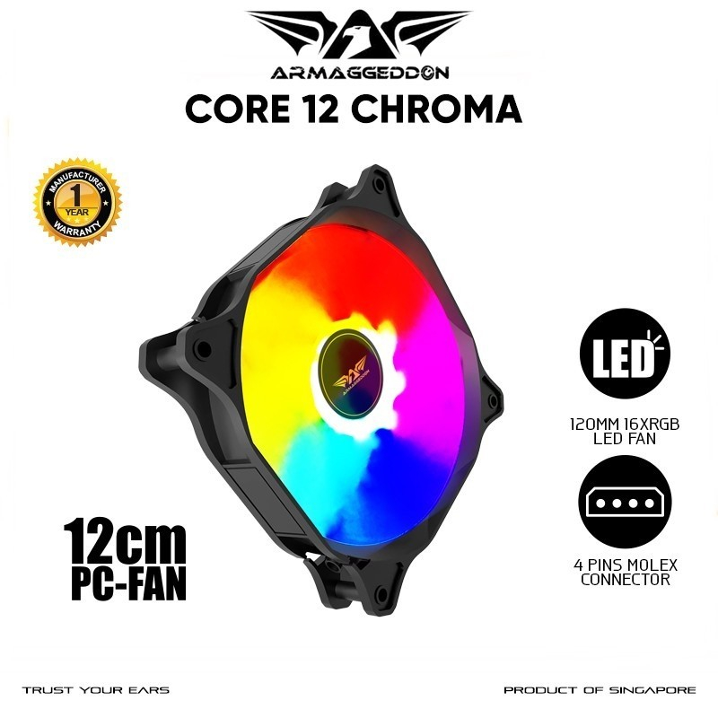 Armaggeddon Core 12 Series adalah fan casing yang memiliki 3 varian warna LED yaitu Red, Blue, Dan Chroma (RGB). Fan Core 12 Series memiliki ukuran standart 12cm yang umum di gunakan oleh mayoritas casing dan 4 buah lubang baut di tiap sudutnya. Bermodalkan power Molex pada power supply, fan ini memiliki kecepatan 1000 RPM yang membuat fan ini tidak berisik namun mampu menjaga suhu PC tetap stabil.