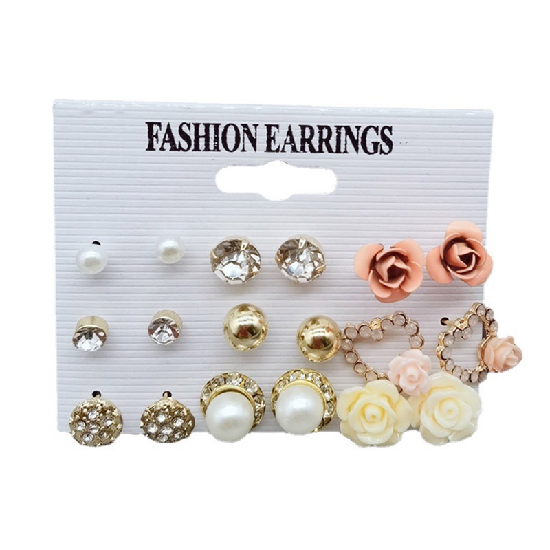 Paket Termasuk: 9 Pasang/Set Fashion Crystal Pearl Flower Ear Studs Earrings