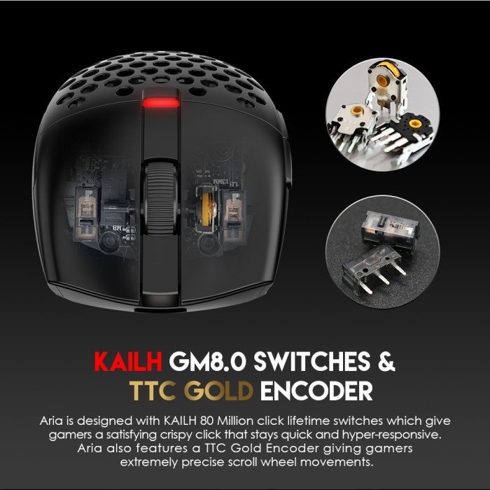 KAILH GM8.0 SWITCHES & TTC GOLD ENCODER Aria dirancang dengan 80 juta klik yang memberikan game klik yang memuaskan serta tetap cepat dan hiper-responsif. Aria juga memiliki fitur TTC Gold Encoder yang memberikan gerakan scroll wheel yang sangat presisi kepada para gamers.