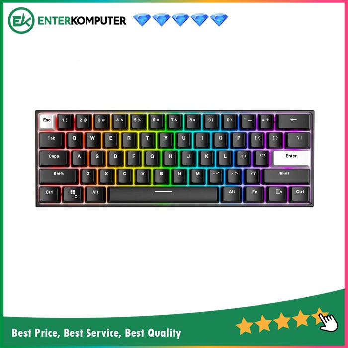 Spesifikasi 3 Connections (Wired, 2.4ghz Wireless, Bluetooth 5.0) up to 5 devices Baterai 1,900 mAH up to 72 hours (RGB OFF) 60% KEYBOARD LAYOUT (61 Tombol) NORTH FACING RGB HOT-SWAPPABLE (Support up to 5 pin Switches) Outemu Switch Bawaan (Blue Switch, Red Switch) Pre-Lube Stabilizer (SHIFT, ENTER, SPACE-BAR, BACKSPACE) Include Damper Foam MAGIC FN Detachable Type-C Onboard Memory ALL ANTIGHOSTING RGB Per-Key Size 294mm x 103mm x 42mm