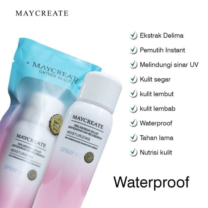 MAYCREATE SPRAY : Berfungsi untuk mencerahkan tubuh dan membuat tubuh tampak glowing bercahaya layaknya artis korea, bisa dipakai sehari2 atau untuk acara tertentu dengan membersikan kesan glamour & sexy pada kulit - Mengandung SPF 30 isi 150 ml gunakan pada bagian seluruh tubuh Suncreen spray spf 50 tidak melengket watefroof Boleh djadikan base makeup Boleh dpakai dmuka badan leher dan ketiak