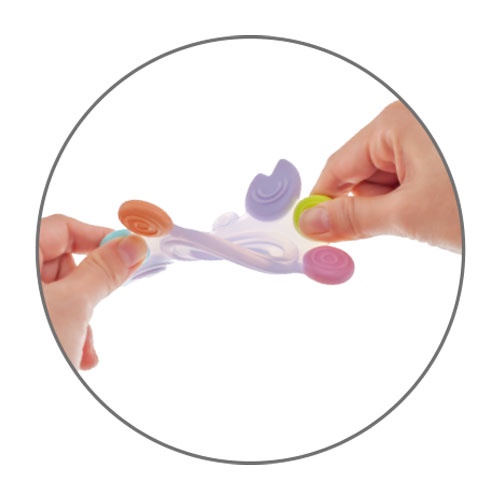 • Desain pijat gelembung • Melatih oklusi oral, koordinasi • Bahan silikon food grade • Meningkatkan perkembangan visual • Berbentuk unik sehingga teether ini dapat mencapai bagian belakang mulut bayi dengan mudah • Desain pegangan yang ringan dan melengkung memudahkan bayi untuk memegangnya • Teether akan membantu merangsang indra dan keterampilan motorik halus bayi • Mencengkeram, menggigit, dan bermain dengan set membantu bayi merangsang latihan otak • Mendukung koordinasi otot