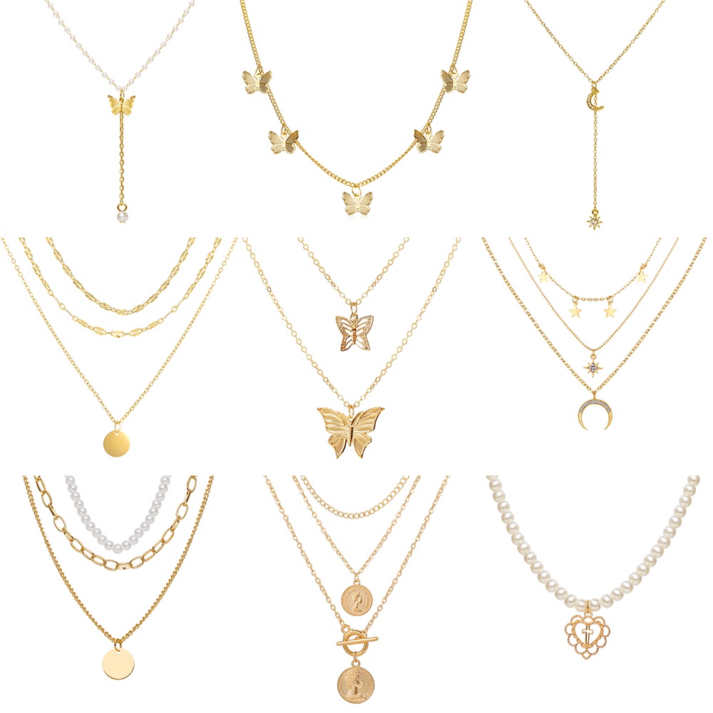 Aksesoris Fashion > Kalung > Liontin > Fashion Vintage Gold Butterfly Multilayer Necklace with Bohemian Pearl Lock Clavicle Chain Necklace for Women Jewelry Accessories