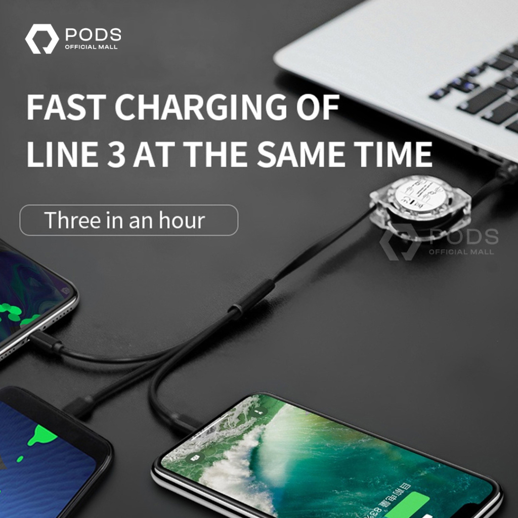 [FAST CHARGING] The Pods 3in1 Retractable Fast Charging Cable - Kabel Charger Cable Charger Untuk IOS / Android Kabel IOS Lightning + Micro USB + Type C / USB TO C / USB TO MICRO USB / USB for iPhone Android Samsung Xiaomi OPPO Vivo by Pods Indonesia