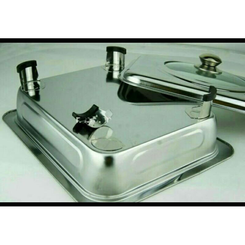 Dilengkapi dengan 4 kaki bongkar pasang ( tinggi 4 cm) pada keempat sudut panci, sangat praktis dalam penyimpanan, tidak memakan banyak tempat. Panjang tutup 30 cm, lebar 24,5 cm, pada tengah tutup panci stainless steel dengan kombinasi kaca ditengahnya, higienis dan memudahkan melihat hidangan yang ada di dalam panci.