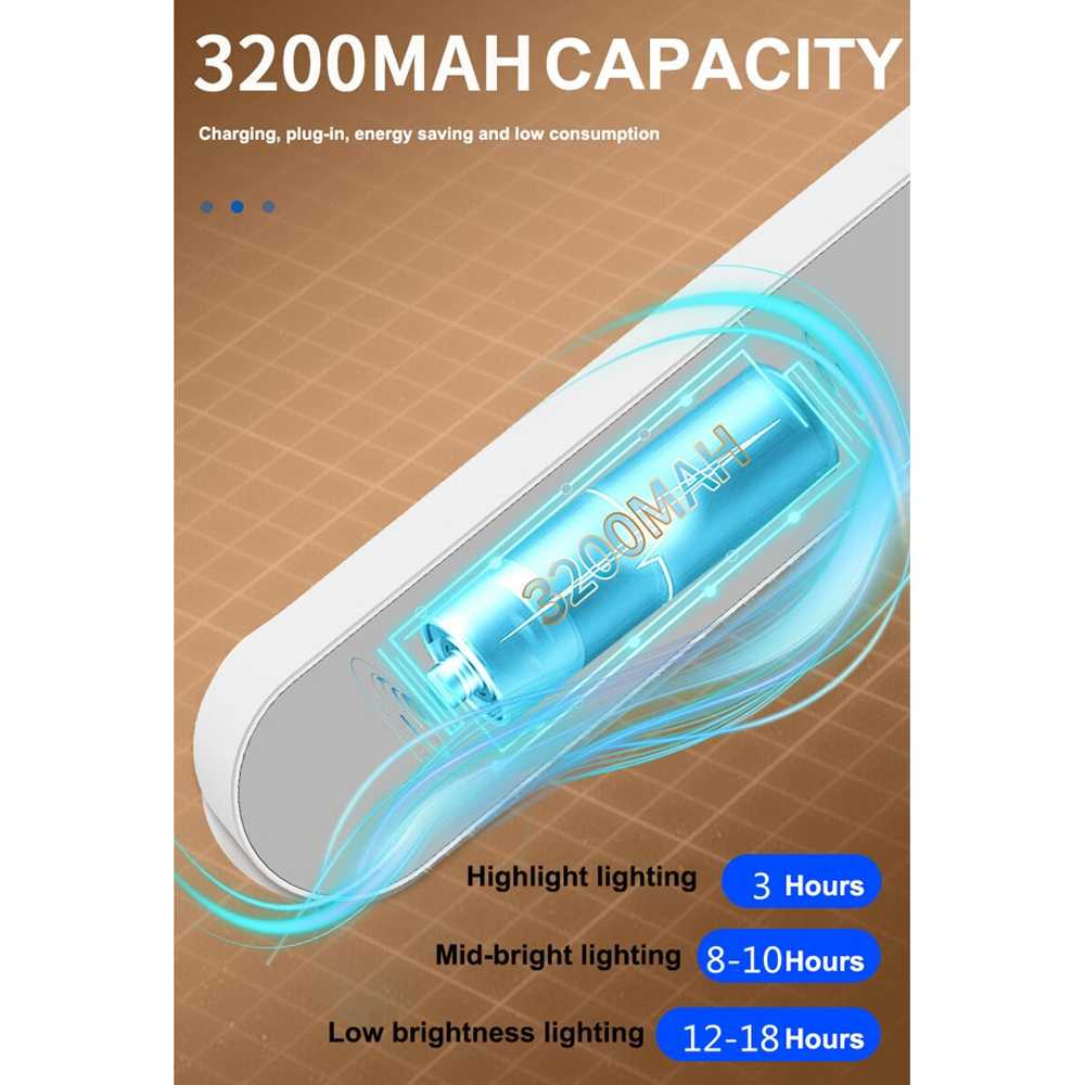 Jumlah LED 20 LED Temperatur Warna Warm White, Cool White dan Neutral White Voltase DC 5 V Daya / Power 5 W Kapasitas Baterai 3200 mAh Material Plastik Dimensi 26 x 2.5 x 4 cm Lain-lain Waktu Pemakaian: 3 - 18 Jam