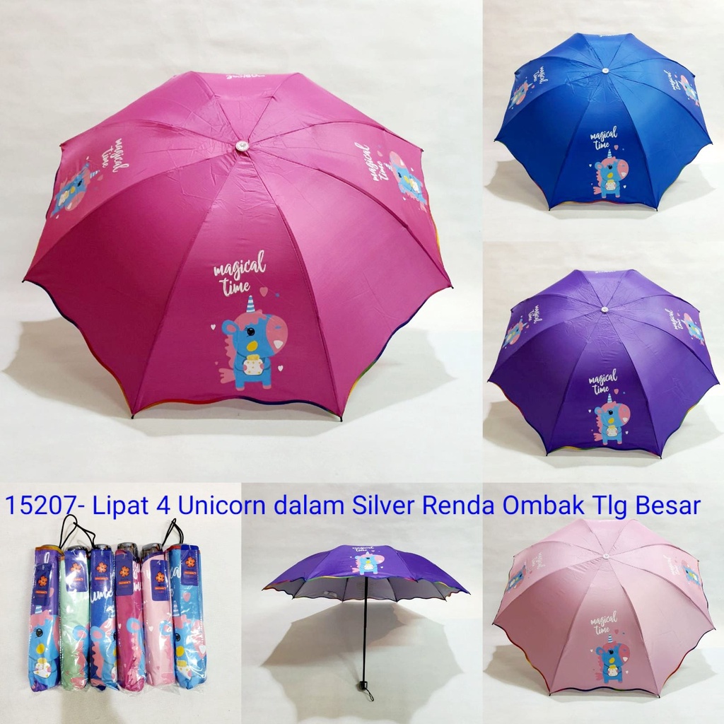 detail payung : 1. lipat 3 dengan motif unicorn di 4 sisi dan pinggir payung gelombang 2. 8 jari jari dan rangka besi hitam anti karat 3. dari bahan polyester dengan lapisan dalam payung silver anti UV 4. ringan dan mudah dibawah kemana mana . foto real 100 % 5. diameter buka 98 cm , panjang tutup 24 cm 6. tersedia 6 warna pilihan : biru tua - ungu - hijau - pink tua - pink muda dan biru muda