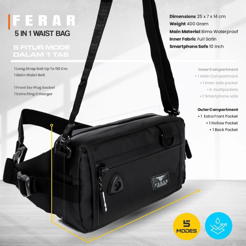 Detail Produk: ✓ 2 Faces/ 2 Muka ✓ 5 Style (Waist Bag, Sling Bag, Clutch Bag, Bike Bag, Hand Bag) ✓ Saku Utama (8 Slot Kompartemen Dalam) ✓ 2 Saku Multi Fungsi ✓ 2 Tali Untuk Waistbag / Sling Bag ✓ Material Tahan Air / Anti Air ✓ Zipper Water Resistant ✓ Desain Simple, Keren, dan Elegan