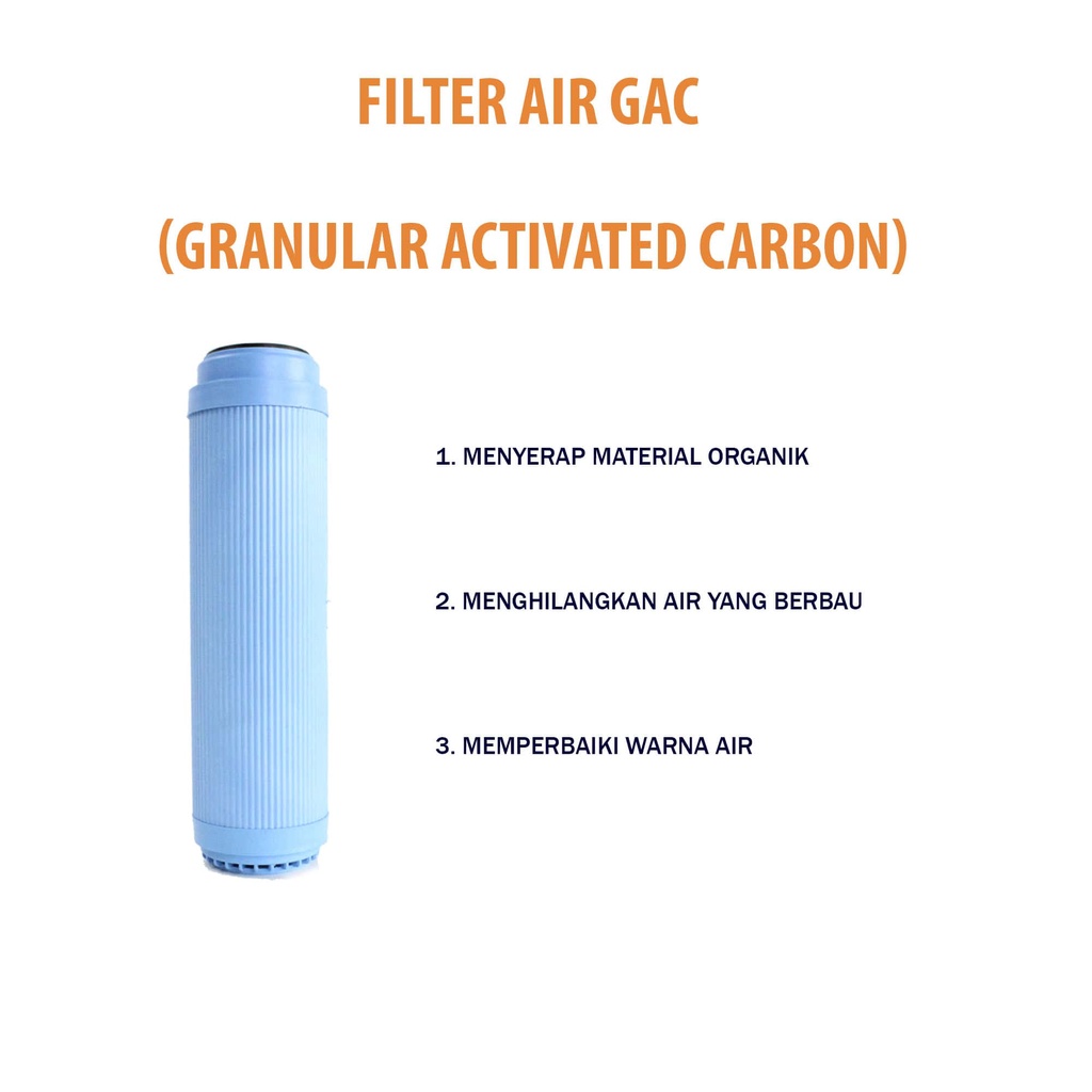 3.GAC (granular actived carbon) - berfungsi Menyerap bau, warna, rasa tak sedap, bahan kimia organik dan sisa klorin.