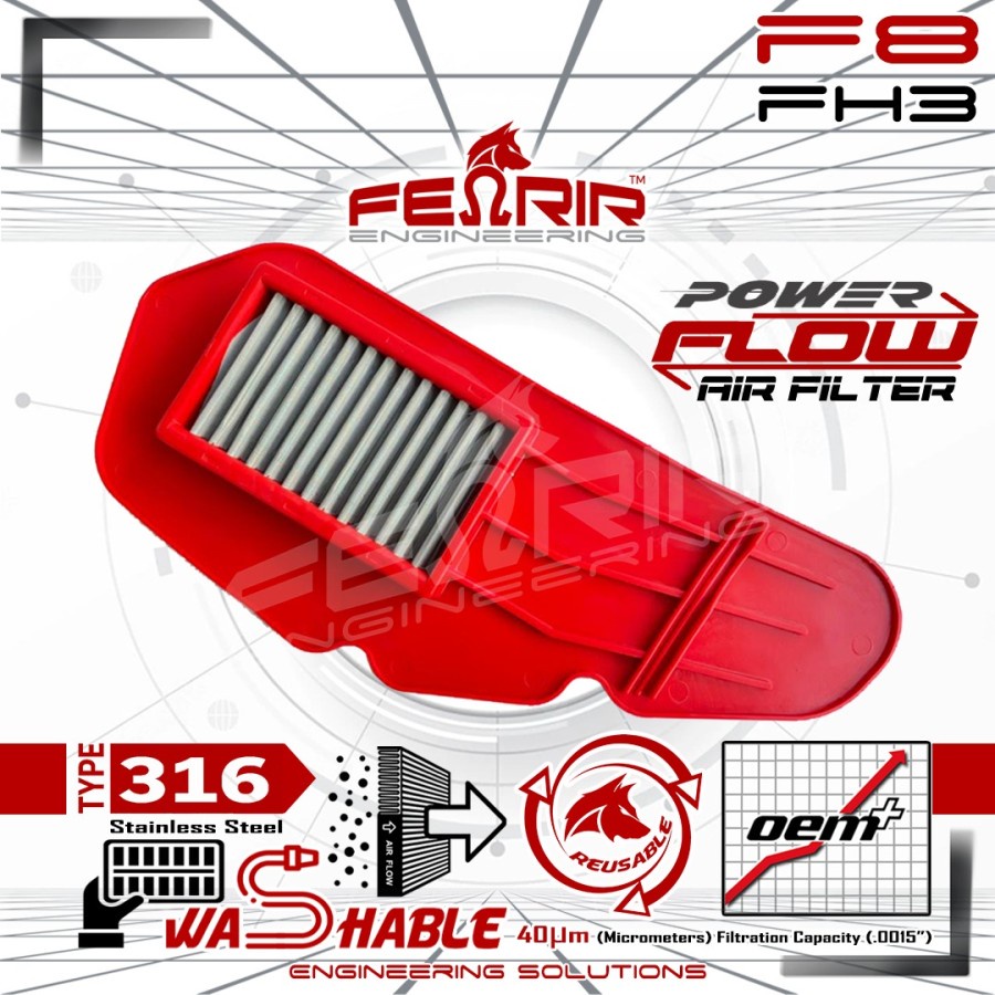 Fenrir Power Flow Air Filter F8 Dirancang khusus untuk menyalurkan aliran udara bertekanan tinggi dengan tingkat penyaringan debu kotoran yang baik agar tetap dapat memberikan perlindungan maksimal terhadap mesin kendaraan anda.