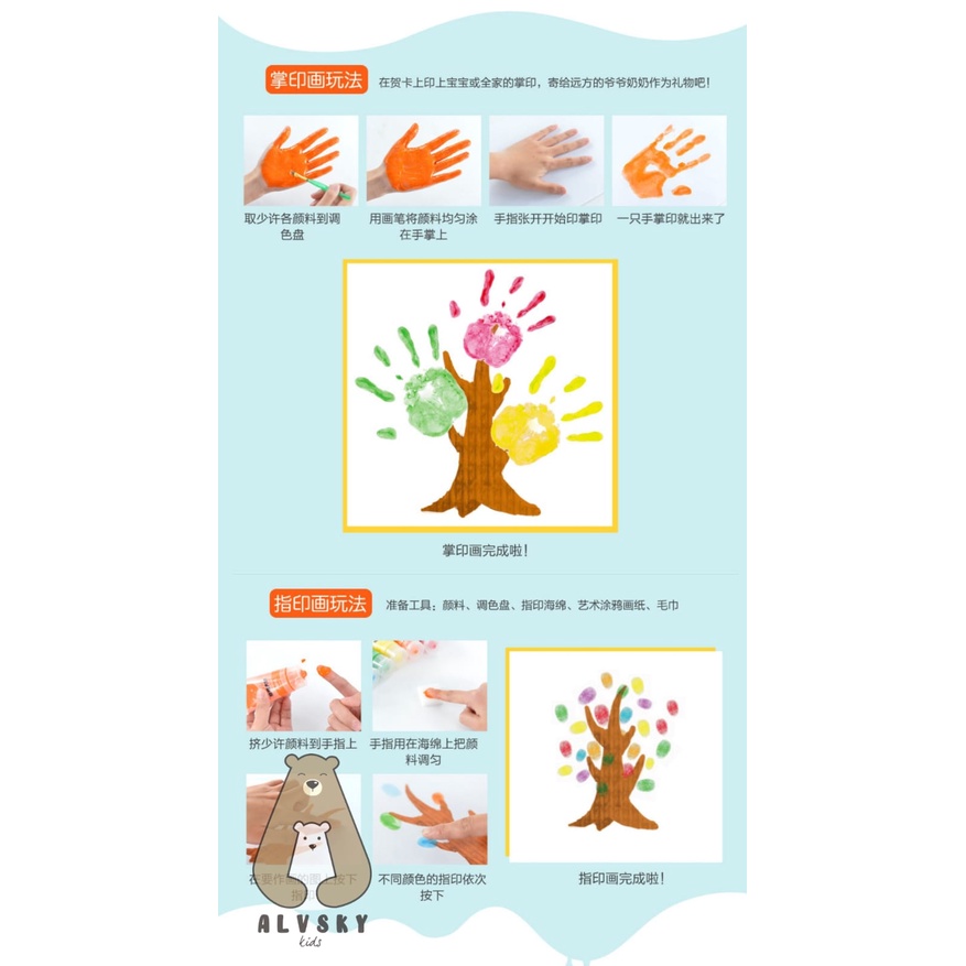 Setiap set berisi : - 6/12 tabung cat jari 20ml dengan warna berbeda dan cerah - 12 lembar gambar - 2 pcs Kuas cat - 1 pcs Palet 6 lubang - 4 model sponge painting brush - 1 Instruction book