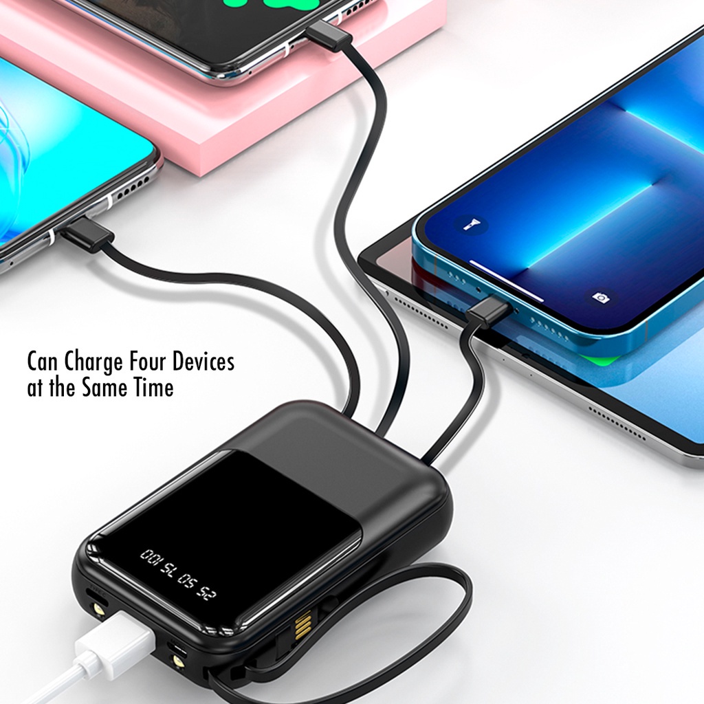 powerbank portabel ini dilengkapi dengan 4 jalur data yang berbeda, yaitu lightning, USB, Micro usb, tipe-c, yang dapat mengisi 4 perangkat berbeda secara bersamaan. Ini juga memberi Anda data USB umum kabel, sehingga Anda dapat membaginya dengan keluarga atau teman Anda di mana saja. Kapasitas 20000mAh mudah untuk memenuhi kebutuhan daya harian, dan dengan bodi ramping, Anda dapat membawanya dengan mudah dan tidak membuang-buang ruang.