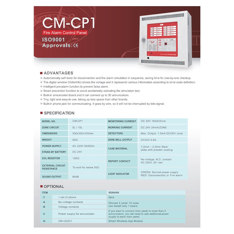 ZONE : 5 CIRCUIT DIMENSION : 330 X 300 X 120 (mm) WEIGHT : 5 KG POWER SUPPLY : AC 220V 50/60Hz STAND-BY BATTERY : DC 24V NOTIFICATION ON MOBILE PHONE : YES