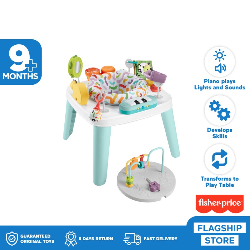 Fisher Price 3-in-1 Hit Wonder Activity Center dengan 3 gaya bermain untuk anak seperti : Permainan duduk Bayi, Meja Bermain bagi Toodler, dan Mainan yang Dapat Dilepas dengan Permainan yang Dapat Dibawa-bawa. Sehingga dapat mengembangkan Keterampilan Motorik Kasar, Keterampilan Sensorik, Keingintahuan & Penemuan. Untuk usia 9-36 Bulan dengan berat maksimal bayi 11,3 kg. Pusat Aktivitas Bayi Bila digunakan dengan tempat duduk, anak harus mampu menegakkan kepala tanpa dibantu dan tidak dapat berjalan atau memanjat keluar dari produk.