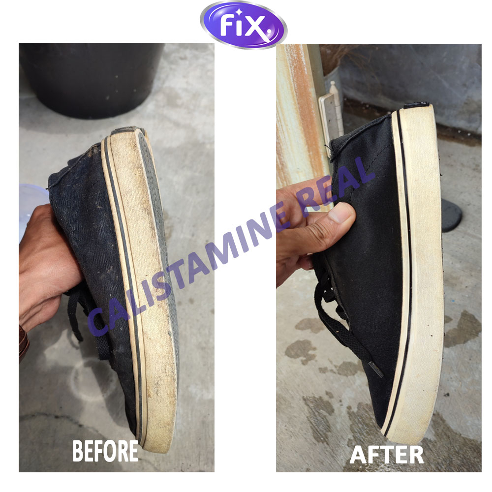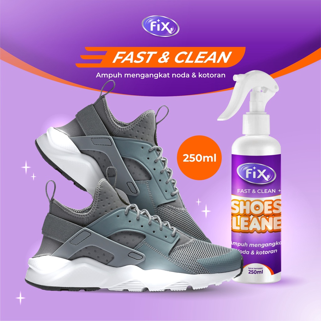 Fast & Clean, Ampuh mengangkat Noda dan kotoranManfaat FIX "Shoe Cleaner" 1. Mampu mengangkat kotoran dan noda di sepatu secara maksimal. 2. Tidak merusak dan tidak membuat warna sepatu menjadi pudar. 3. Aman untuk semua jenis bahan sepatu. 4. Menjaga kualitas bahan dan warna sepatu tetap dalam kondisi sempurna. 5. Mudah digunakan dan siap pakai tanpa harus di bilas. 6. Dapat digunakan berulang kali, sehingga dapat menjadi aksesoris perawatan sepatu jangka waktu lama.