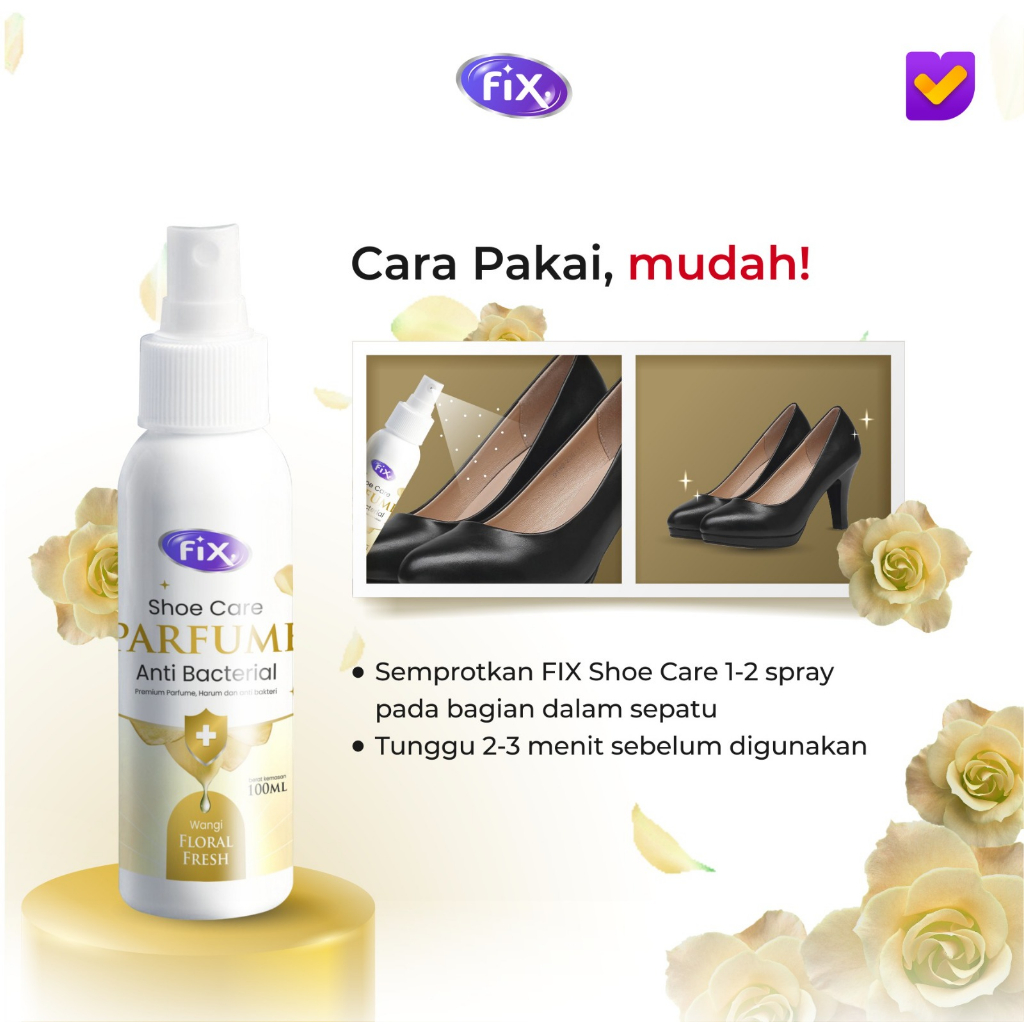"Manfaat FIX ""Shoe Care & Parfum""" 1. Mampu menghilangkan bau tidak sedap pada sepatu secara maksimal dan cepat 2. Tidak merusak bahan dan material sepatu 3. Cocok untuk di gunakan sehari hari sebelum Beraktifitas 4. Aman untuk semua jenis bahan sepatu dan kulit 5. Menjaga sepatu dari bakteri yang menyebabkan bau. 6. Melembabkan area dalam sepatu 7. Mudah digunakan dan siap pakai 8. Dapat digunakan berulang kali, sehingga dapat menjadi aksesoris perawatan sepatu jangka waktu lama