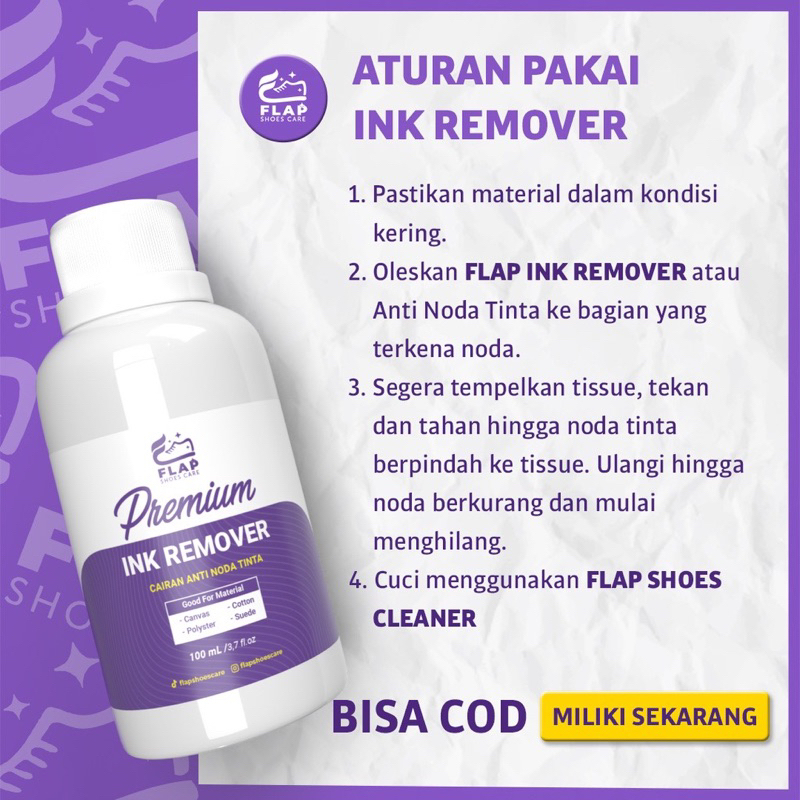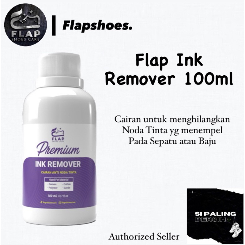 FLAP INK REMOVER (100mL) atau Anti Noda Tinta adalah produk khusus penghilang noda tinta pada sepatu atau apparel. Pada dasarnya noda tinta pada sepatu atau apparel tidak dapat dihilangkan, namun dapat dipindahkan ke media lainnya seperti tissue. FLAP INK REMOVER atau Anti Noda Tinta diformulaskan dari bahan - bahan yang aman serta tidak merusak material.