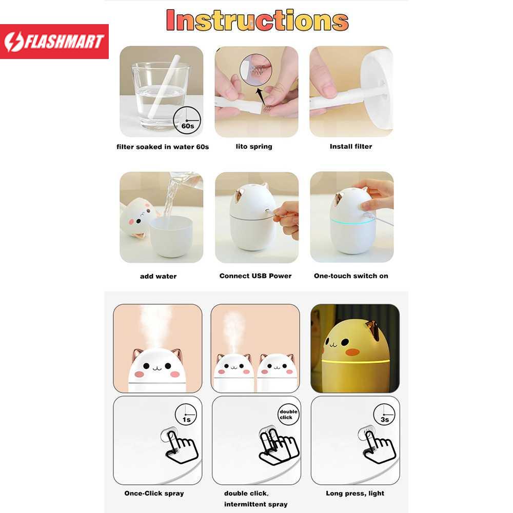 Spesifikasi REUP Air Humidifier Purifier Pelembab Ruangan Cute Cat 250ML - A301 Tingkat Kebisingan : > 25 dB Kapasitas Air : 250 ml Voltase : 5 V Daya / Power : 1 A Material : Plastik ABS Dimensi : 11 x 8 cm Lain-lain : Volume Semprotan Perjam: 35 ml