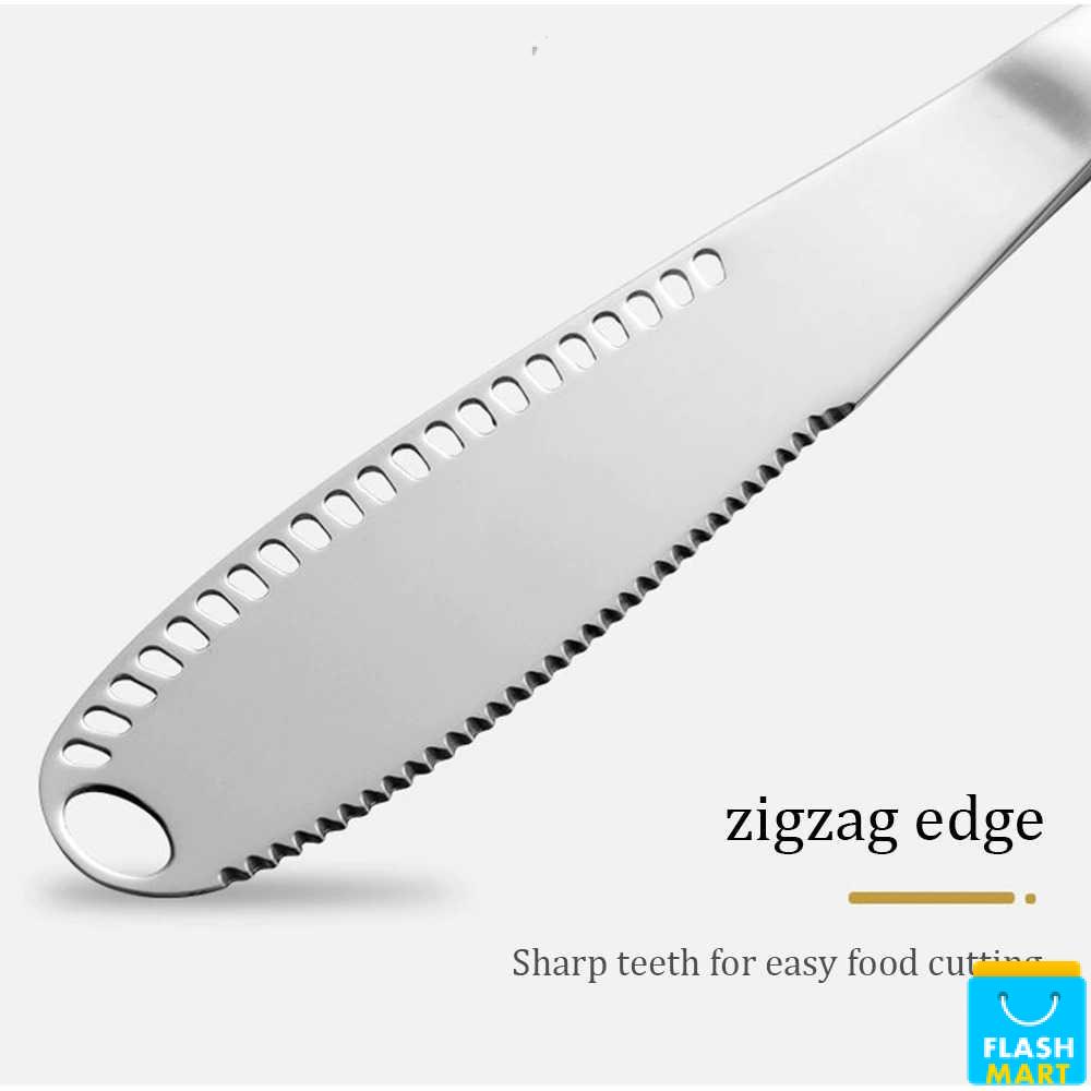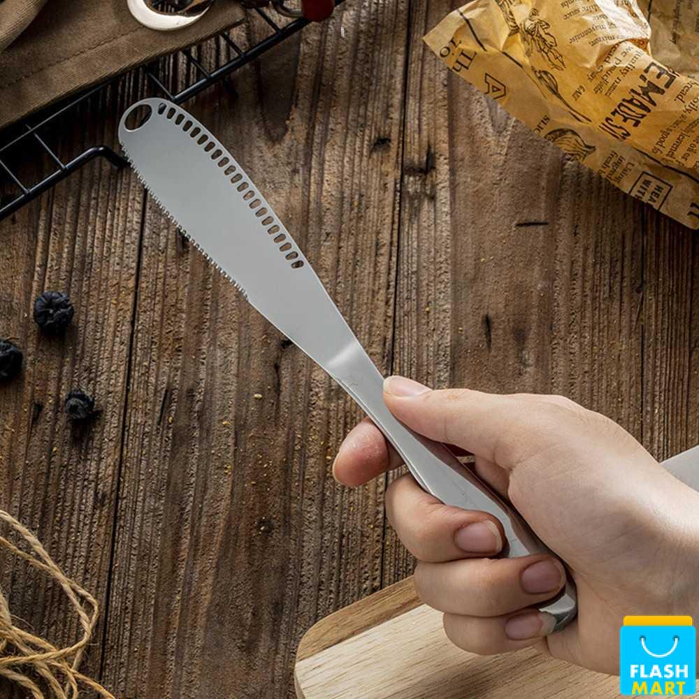 Pisau unik ini didesain khusus untuk mengoles mentega ataupun selai sehingga memudahkan Anda saat mencampurkan mentega ke roti atau ke bahan makanan lainnya. Terbuat dari bahan stainless steel membuat pisau ini aman dari karat dan tak membahayakan kesehatan. Fitur Cocok Untuk Roti Pisau ini cocok digunakan untuk mengoleskan selai atau mentega secara merata. Anda dapat memotong mentega dan keju dengan mudah namun bilah pisau tidak tajam sehinggaaman digunakan.