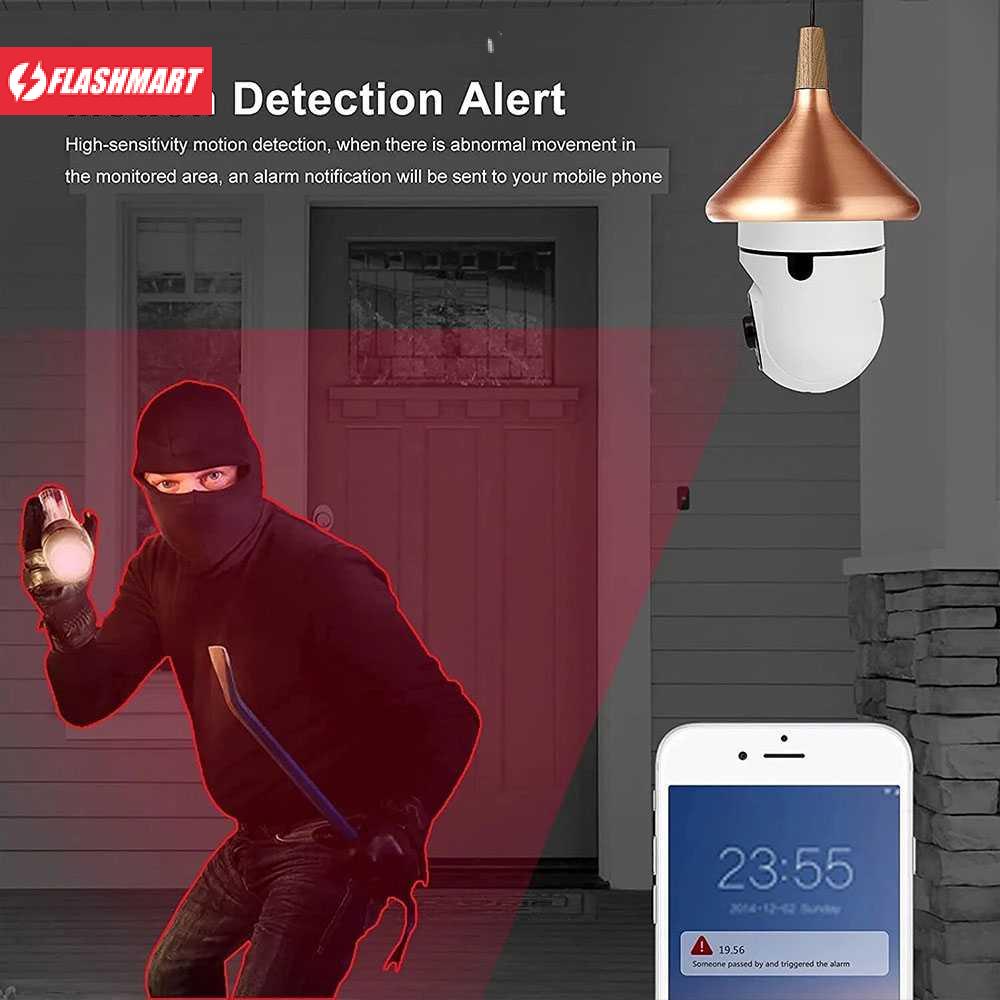 Kamera CCTV menggunakan soket lampu E27 sebagai dudukannya sehingga Anda bisa membuat kamera CCTV ini seolah bohlam lampu yang dipasang. CCTV ini dapat terkoneksi ke jaringan internet sehingga dapat diakses dari smartphone. Kamera CCTV jenis ini sangat cocok diletakkan pada ruangan yang ingin Anda pantau dan orang-orang tidak akan menyadari ada kamera CCTV di ruangan tersebut. Fitur Kamera CCTV Bohlam Lampu Kamera CCTV Ini menggunakan dudukan bohlam lampu E27 sebagai wadahnya. Hal itu membuat Anda jauh lebih aman dibandingkan kamera CCTV pada umumnya karenaorang tidak akan terlalu curiga saat Anda memasang kamera CCTV ini untuk memantau keamanan rumah Anda.