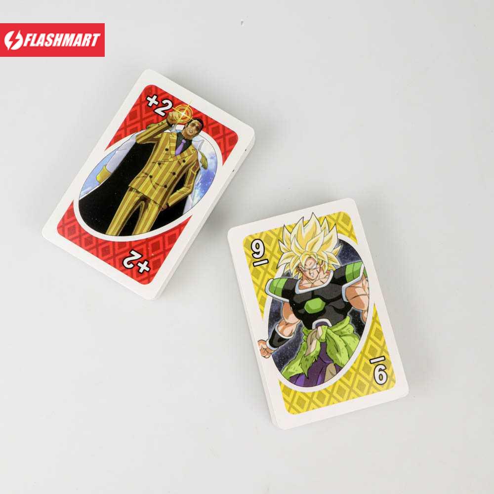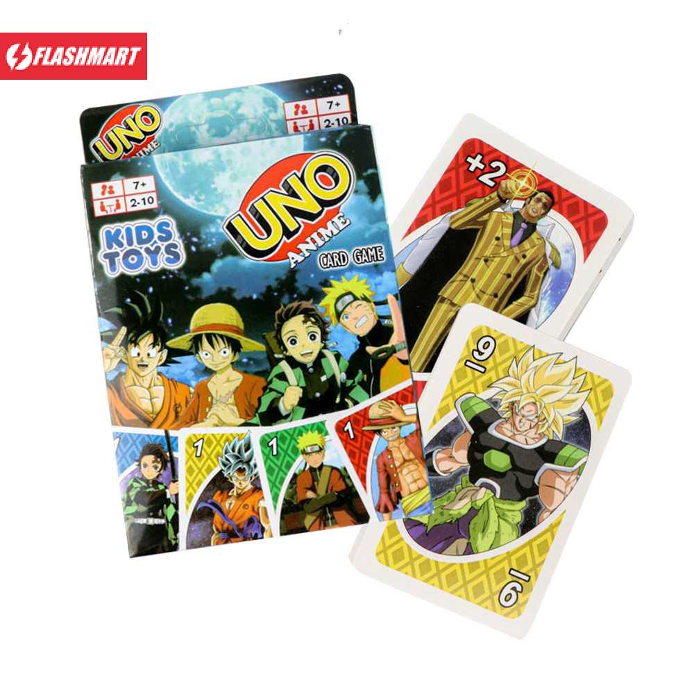 Desain Kartu Anime Set kartu Uno ini memiliki desain yang berbeda dengan Uno biasa. Anda akan mendapatkan set Uno dengan tema anime, dimana terdapat banyak karakter anime populer seperti Naruto, Dragon Ball, Onepiece dan Kimetsu no Yaiba.