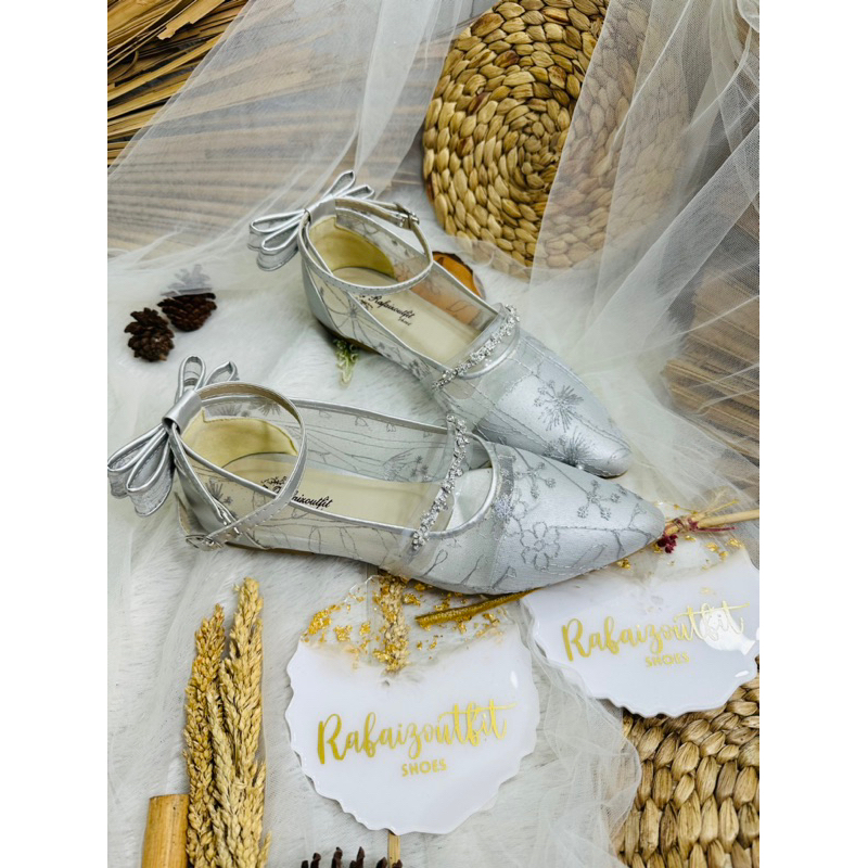 Detail Flatshoes wanita vilea wisuda wedding tali pita silver