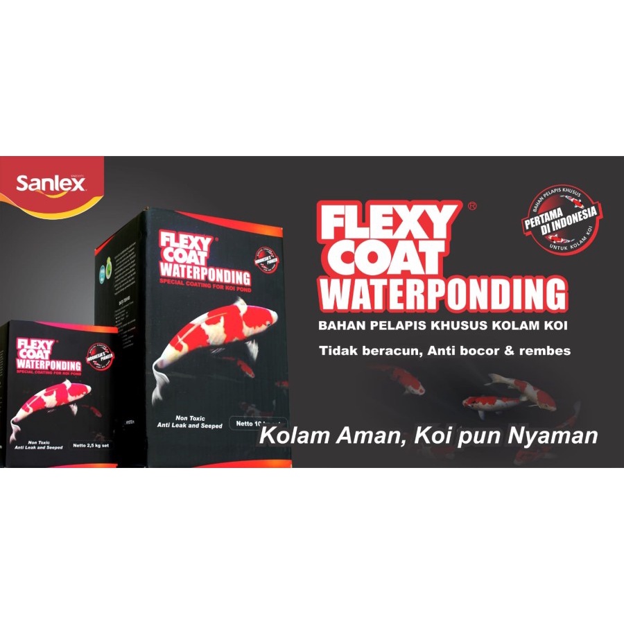 FLEXYCOAT WATERPONDINGadalah bahan pelapis khusus kolam Koi/ikan hias (anti bocor dan rembes) yang aman untuk ikan. Merupakan bahan pelapis untuk kolam Koi/ikan hias dengan 2 komponen yaitu cairan dan semen powder.