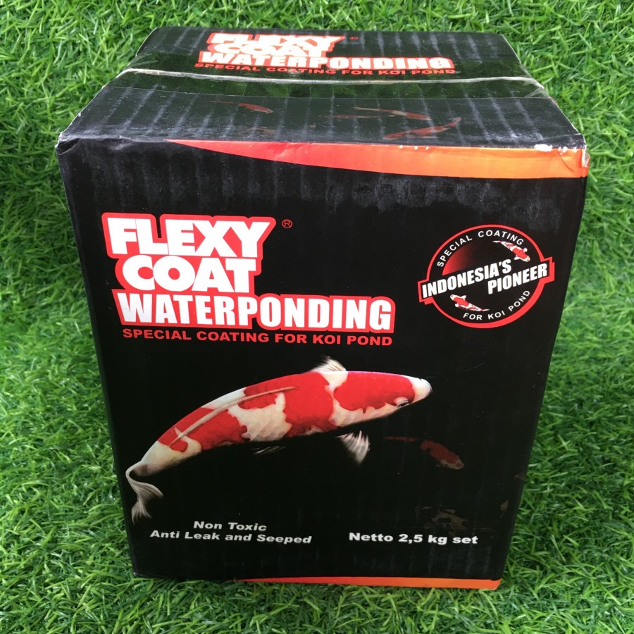 FLEXYCOAT WATERPONDINGadalah bahan pelapis khusus kolam Koi/ikan hias (anti bocor dan rembes) yang aman untuk ikan. Merupakan bahan pelapis untuk kolam Koi/ikan hias dengan 2 komponen yaitu cairan dan semen powder.