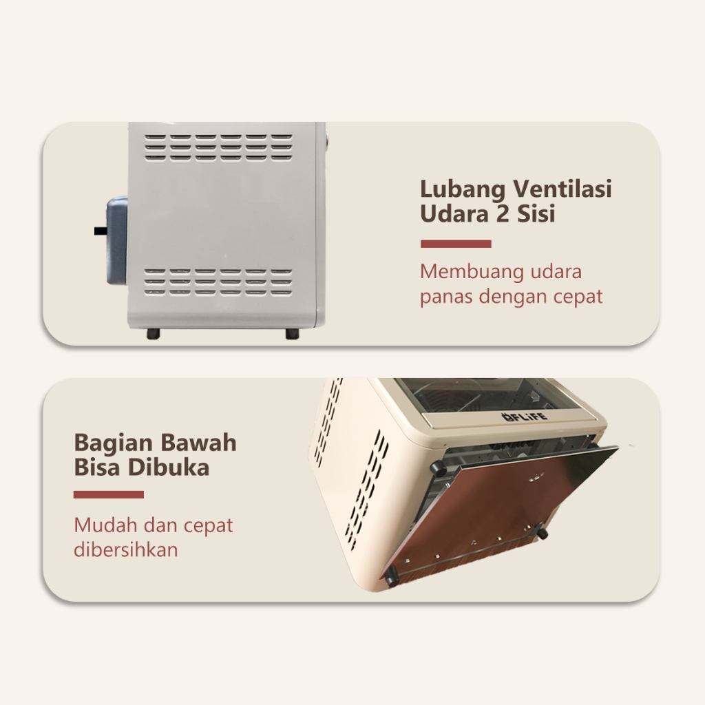 Fitur MultiFungsi Tampilan klasik Kapasitas pas 12L 360°Sirkulasi udara panas Suhu Luas 80°- 230 °C Menyaksikan proses memasak