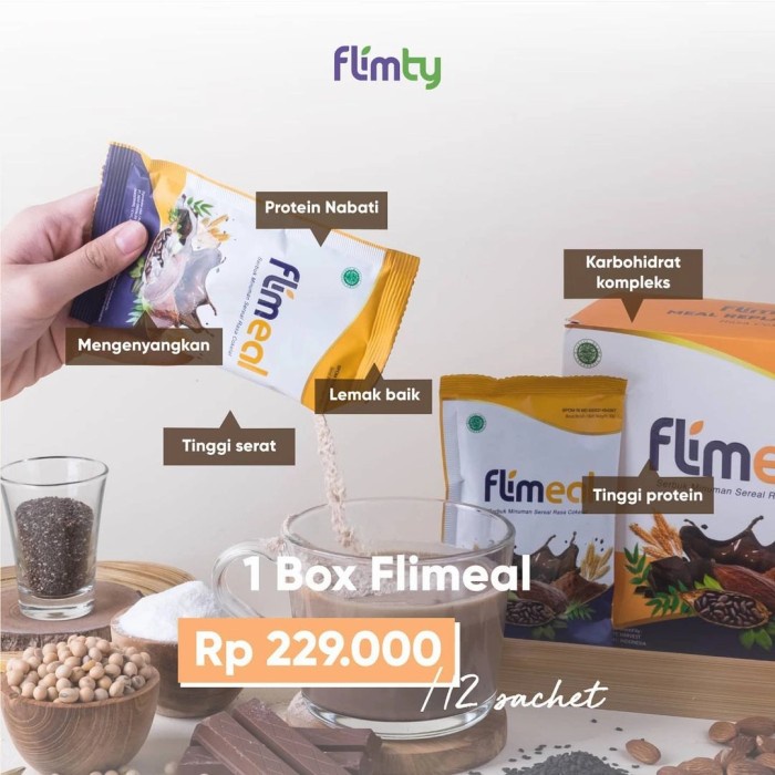 Apa itu Flimeal? Flimeal adalah minuman pengganti menu sarapan atau Meal Replacement yang diformulasikan khusus untuk Anda yang sedang mempertahankan atau menurunkan berat badan. Mengandung bahan-bahan tinggi protein dan serat seperti kacang-kacangan, kedelai isolat, dan chia seed, Flimeal berfungsi sebagai minuman pengganti sarapan guna memenuhi kebutuhan nutrisi serta energi harian Anda tanpa berpengaruh terhadap peningkatan berat badan Anda.
