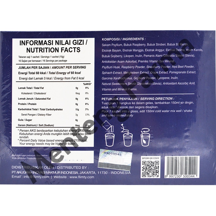 Manfaat Kandungan pada Flimty : - Pomegranate, Goji Berry dan Red Beet : Mengandung antioksidan yang tinggi, mengandung anti-inflamasi, membantu mencegah penuaan dini, serta membantu proses detoksifikasi racun yang ada dalam tubuh. - Psyllium Husk dan Soluble Fiber : Membantu menangani masalah pencernaan, menyehatkan usus besar serta membantu menurunkan berat badan. - Prebiotik - Inulin, campuran buah dan sayur : Membantu meningkatkan kerja sistem kekebalan tubuh, membantu menangkal radikal bebeas, membantu meningkatkan kesehatan kulit