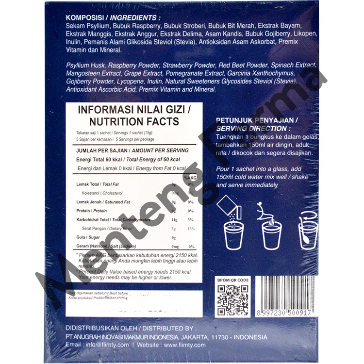 Manfaat Kandungan pada Flimty : - Pomegranate, Goji Berry dan Red Beet : Mengandung antioksidan yang tinggi, mengandung anti-inflamasi, membantu mencegah penuaan dini, serta membantu proses detoksifikasi racun yang ada dalam tubuh. - Psyllium Husk dan Soluble Fiber : Membantu menangani masalah pencernaan, menyehatkan usus besar serta membantu menurunkan berat badan. - Prebiotik - Inulin, campuran buah dan sayur : Membantu meningkatkan kerja sistem kekebalan tubuh, membantu menangkal radikal bebeas, membantu meningkatkan kesehatan kulit
