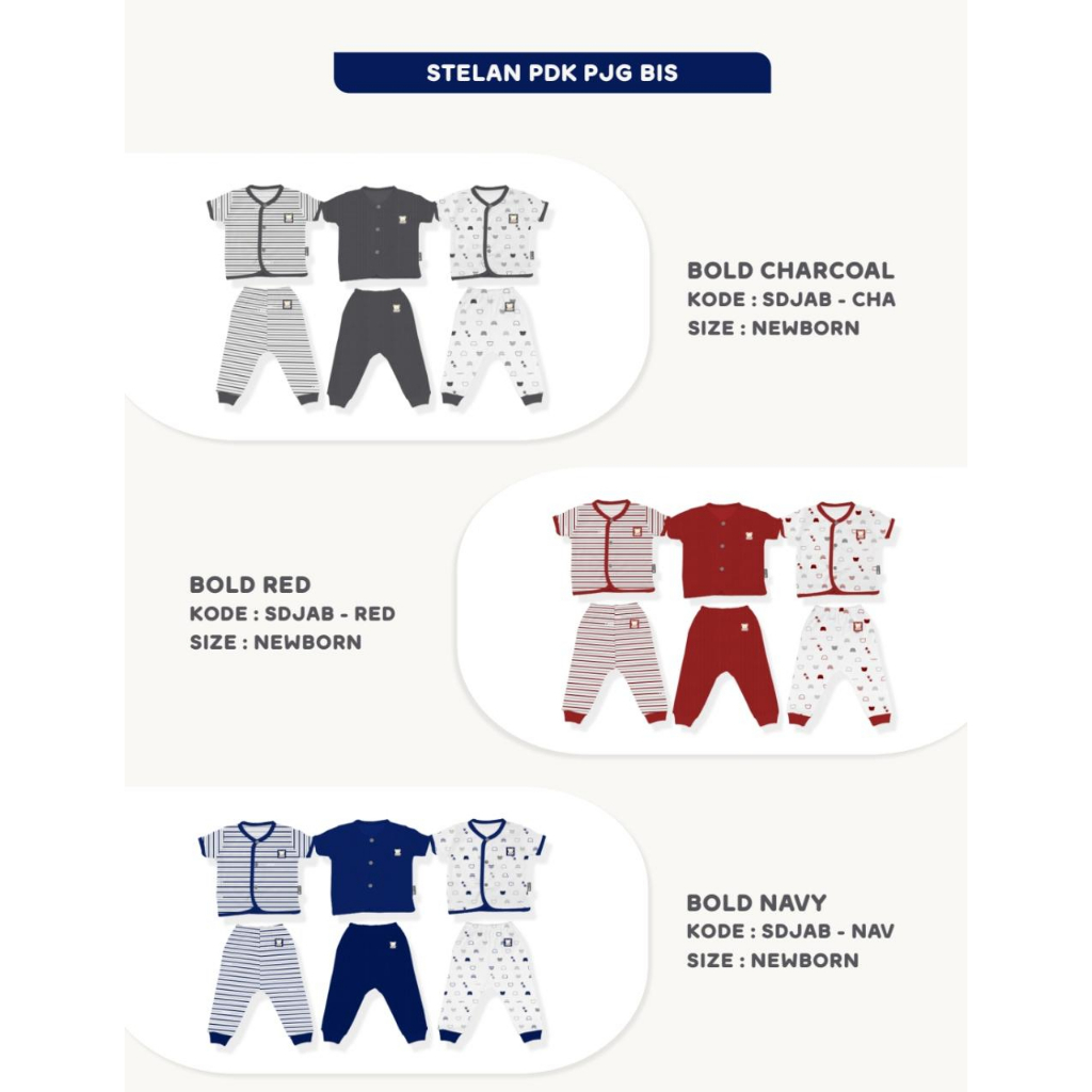 SIZE: NB : 0-3 bulan, 3-5 kg (Baju LD 23 P 27, Celana LP 15-22 P 19) LD = Lebar Dada LP = Lebar Pinggang P = Panjang Semua ukuran dalam cm. BAHAN : Kaos katun halus dan lembut banget. Nyaman banget dipakai untuk sehari-hari.