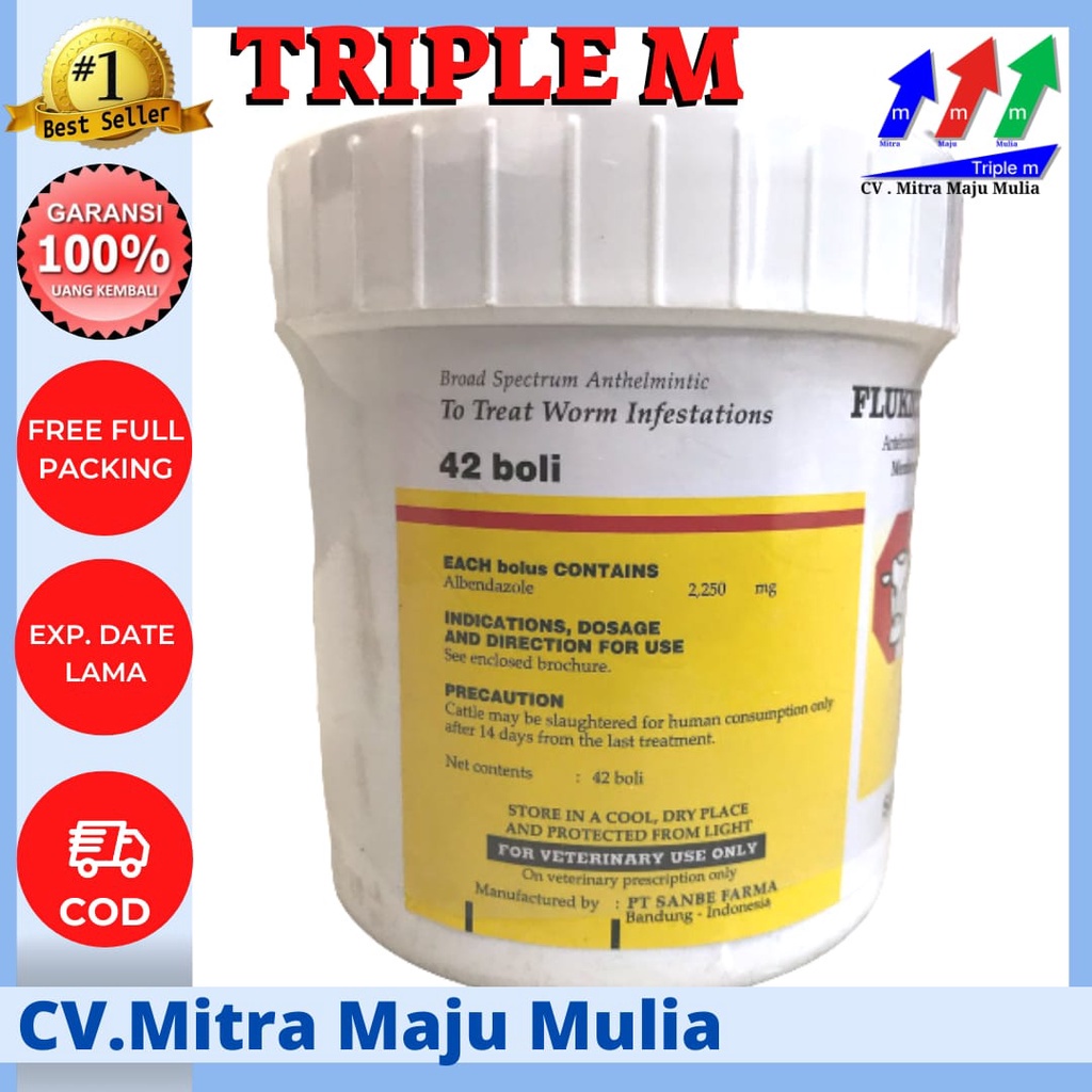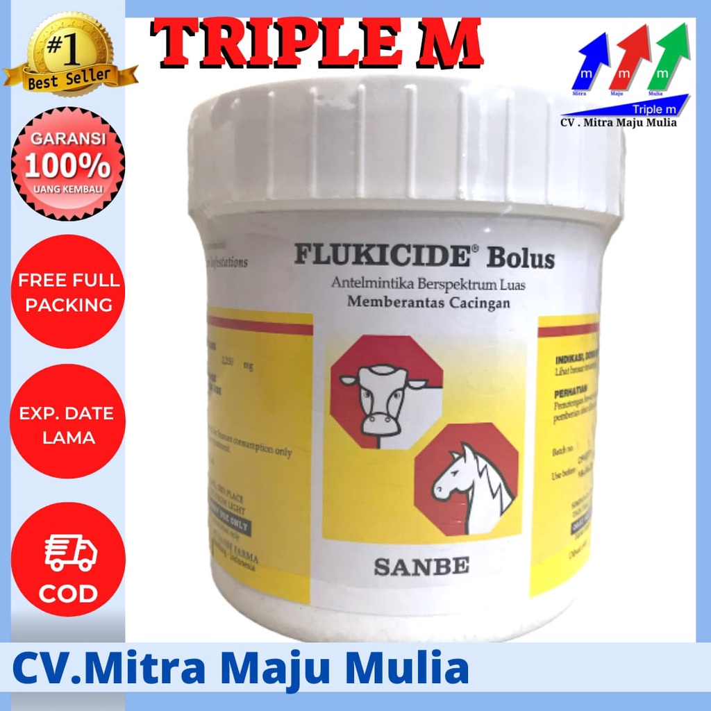 Flukicide Bolus diindikasikan untuk memberantas infestasi cacing pada sapi, domba, kambing, kuda dan ternak besar lainnya.