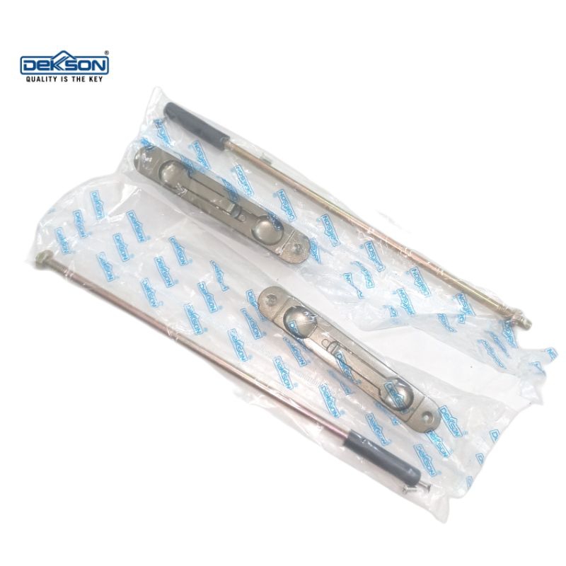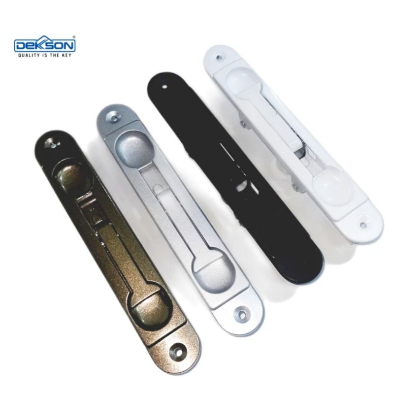 Flush Bolt Merek Dekkson Harga yang tertera di display adalah harga per-set (2pcs) Digunakan untuk slot pengaman pada pintu frame aluminium Tersedia dalam warna: WH/White NA/Silver BL/Black YBC/ Brown