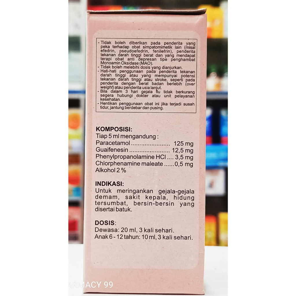 Dosis dewasa dan anak >12 tahun: 3 kali sehari 4 sendok takar 5ml. anak 6-12 tahun: 3 kali sehari 2 sendok takar 5ml Penyajian diminum dengan atau tanpa makanan